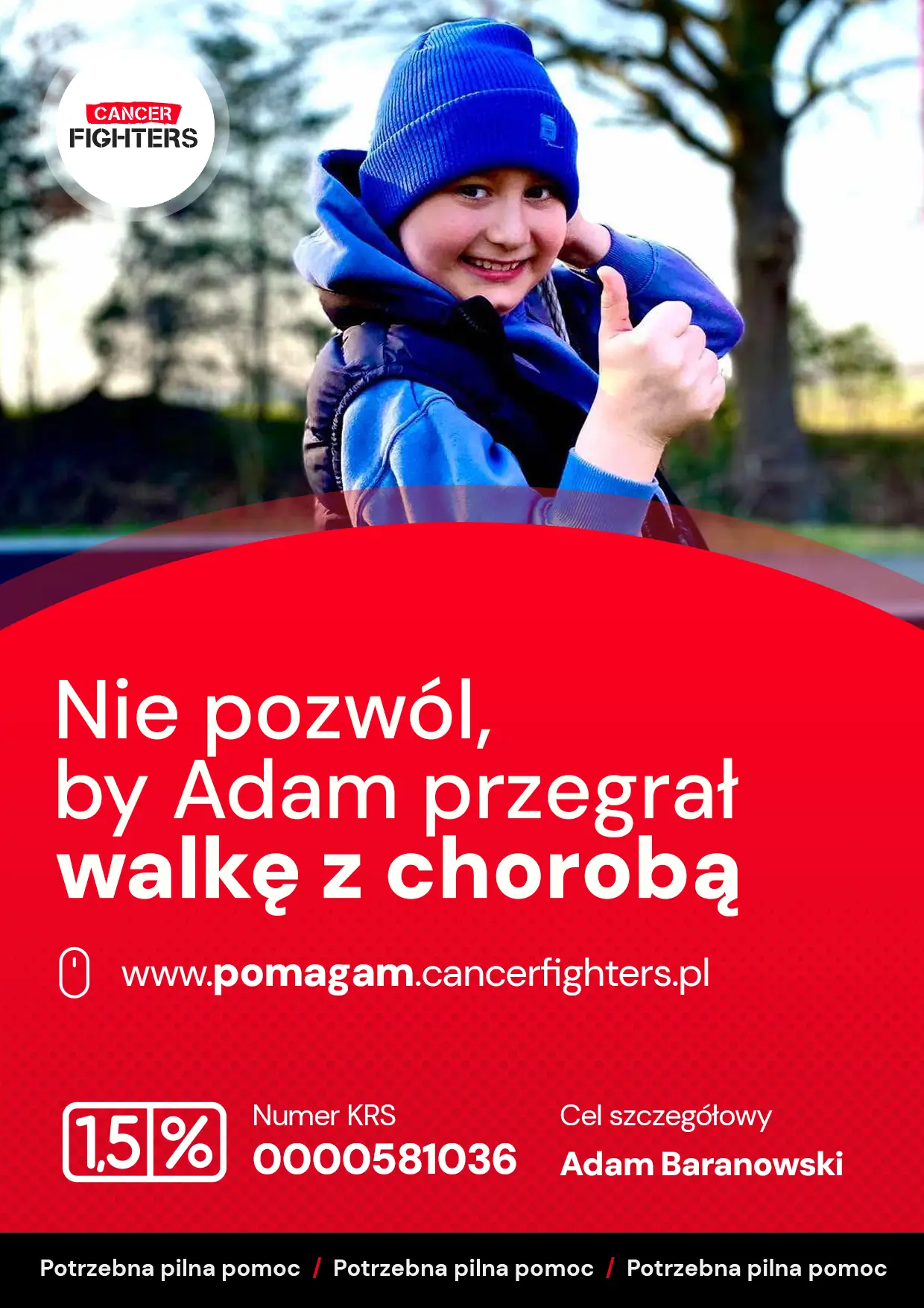 Adam obecnie przebywa na leczeniu podtrzymującym, otrzymuje chemię w tabletkach.