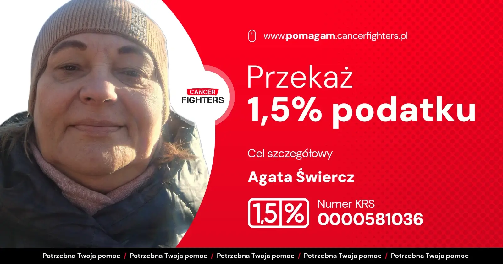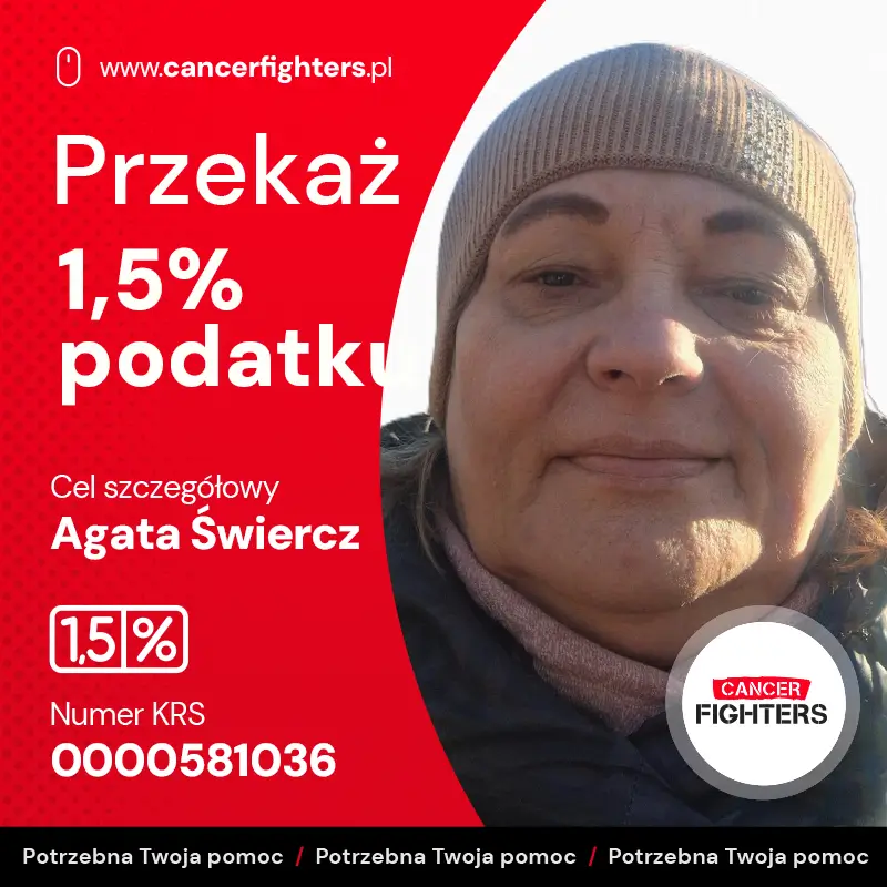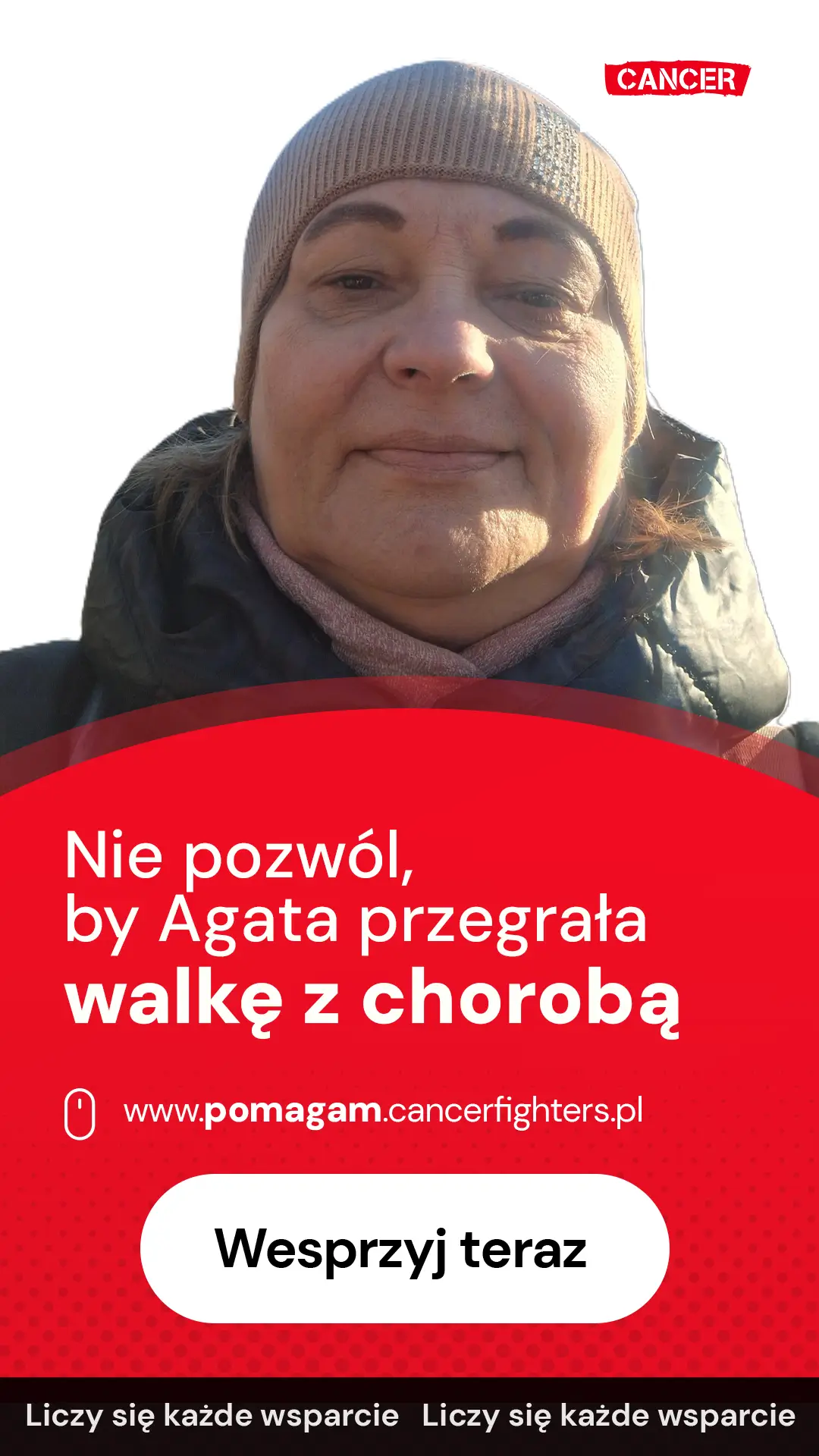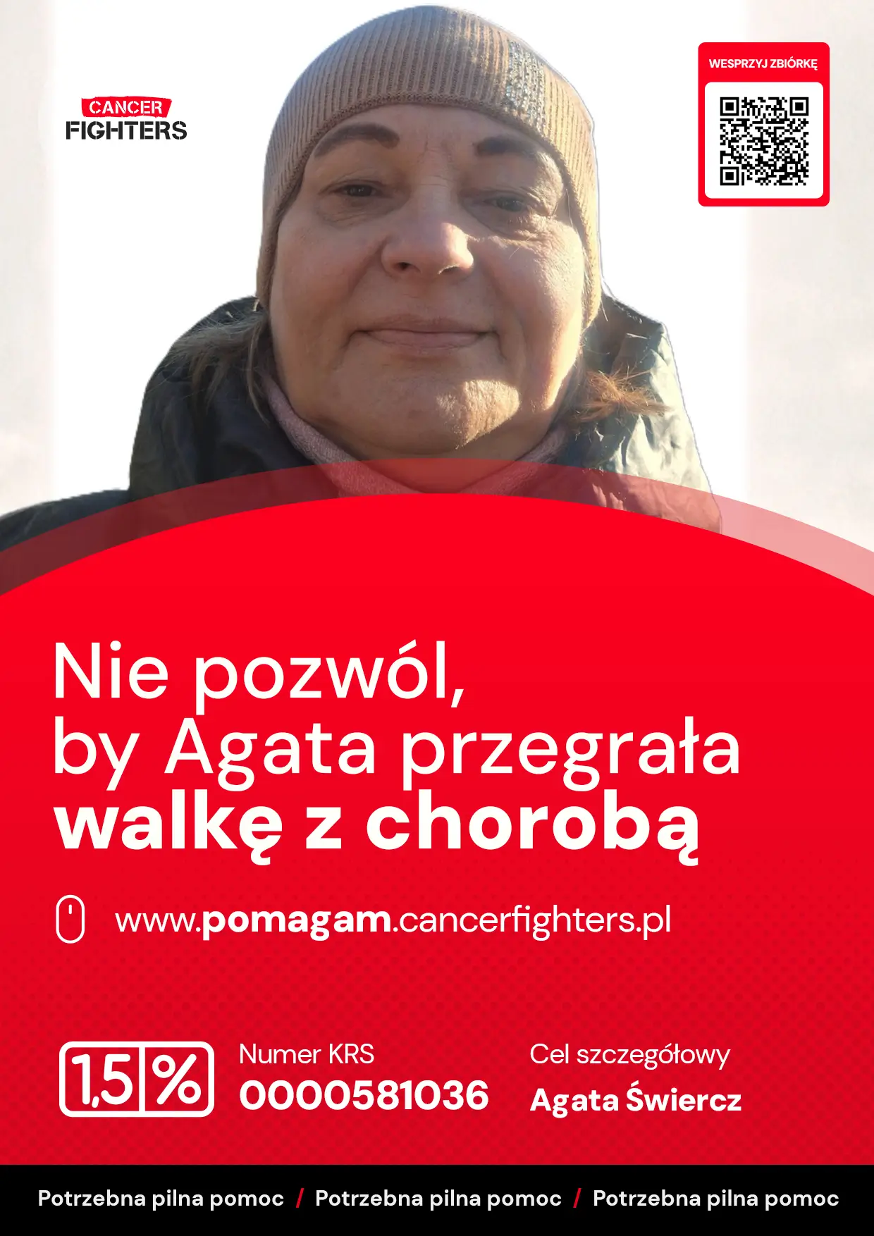 Agata przebywa w domu pod opieką najbliższych. W codziennych czynnościach pomaga jej syn, a ciężar utrzymania rodziny spoczywa na mężu pracującym za granicą, który wspiera ją z daleka i wraca, gdy tylko może. Na co dzień towarzyszy jej również 86-letnia mama, z którą dzieli spokojne chwile dnia. Z powodu stanu zdrowia Agata nie pracuje, a kontakty społeczne zostały ograniczone niemal do minimum. Nasilające się objawy choroby dwubiegunowej, przewlekły ból i osłabienie prowadzą do utraty motywacji i poczucia sprawczości. Koszty leczenia, leków i opieki rosną, dlatego prosi o wsparcie, które pozwoli jej zachować bezpieczeństwo i skupić się na zdrowieniu. W tej sytuacji pomoc innych staje się realną szansą na odciążenie rodziny i przywrócenie choć części stabilności w codziennym życiu.
