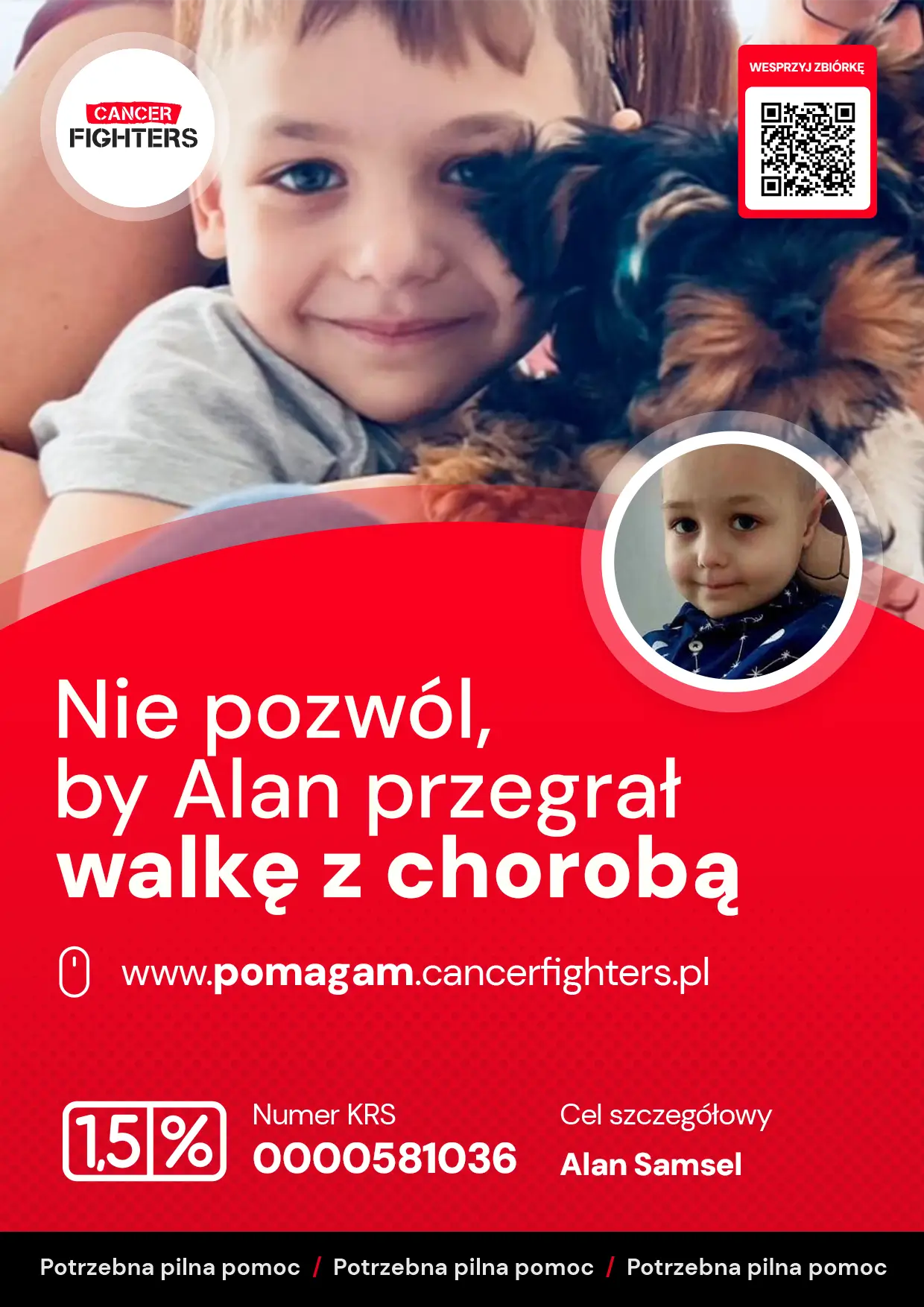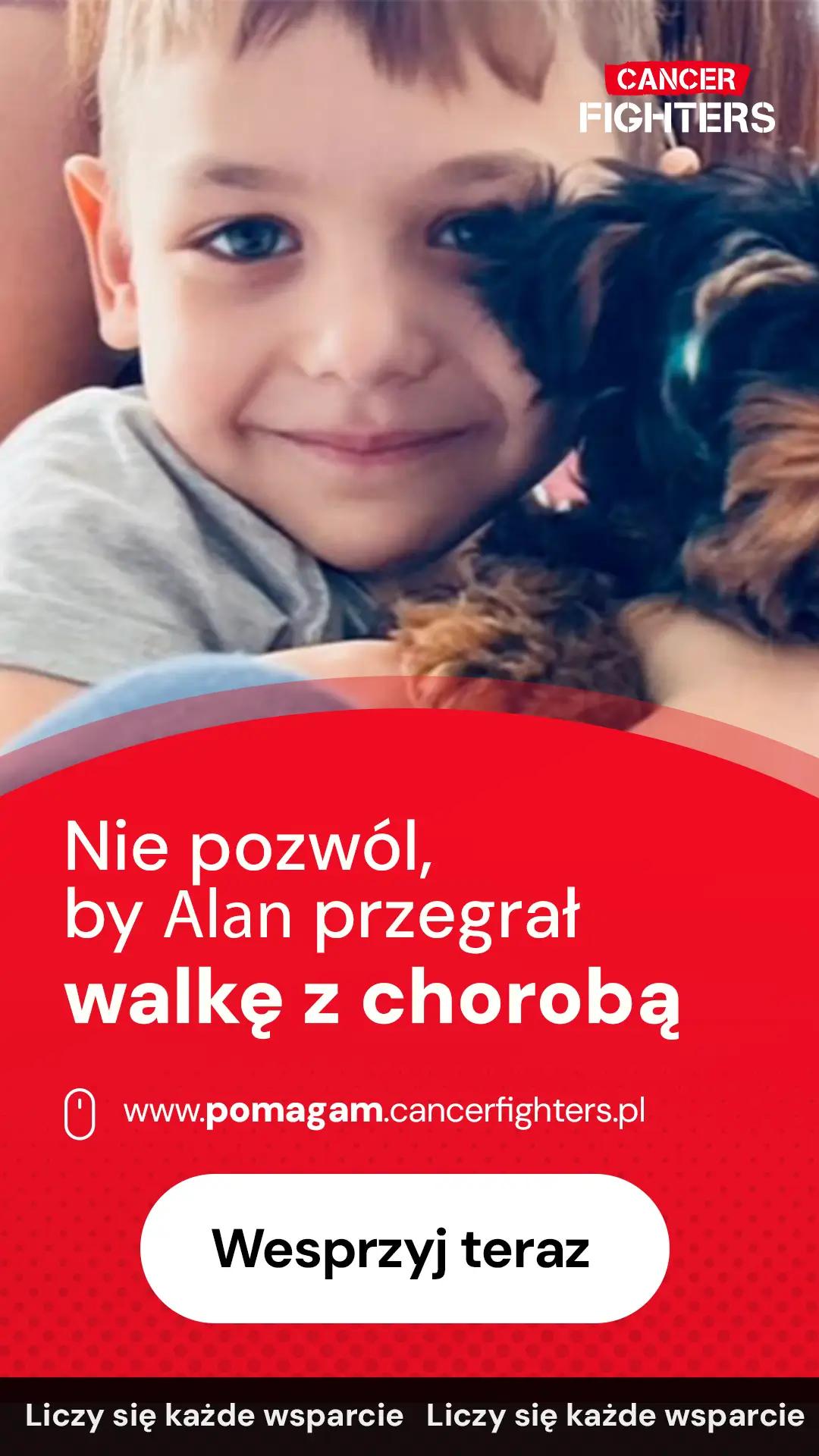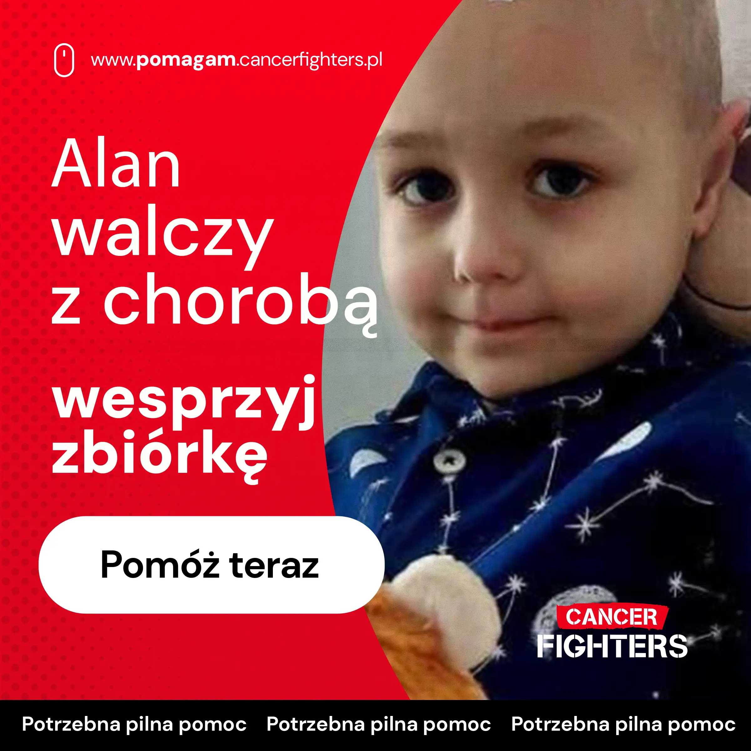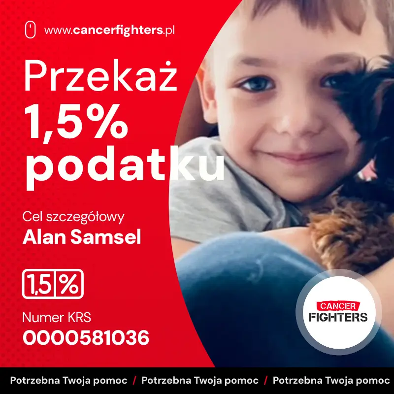 W grudniu 2023 roku u Alana nagłe pogarszające się objawy doprowadziły do pilnej hospitalizacji i szeregu badań: biopsji, odbarczenia płuca, punkcji lędźwiowej i rezonansu. Wyniki potwierdziły diagnozę, której rodzina najbardziej się obawiała — chłoniaka T-komórkowego w trzecim stadium. Od tego momentu ich życie zatrzymało się w miejscu, a wielomiesięczne, intensywne leczenie według programu LBL 2018 stało się codziennością chłopca. Choroba przyniosła liczne powikłania, m.in. zespół PRES, krwotoczne zapalenie pęcherza i napady padaczkowe, które wymagały nieustannej czujności i gotowości na kolejne kryzysy. Od września 2024 roku Alan jest na leczeniu podtrzymującym, a każda kontrola staje się momentem napięcia, który decyduje o dalszych krokach terapii.