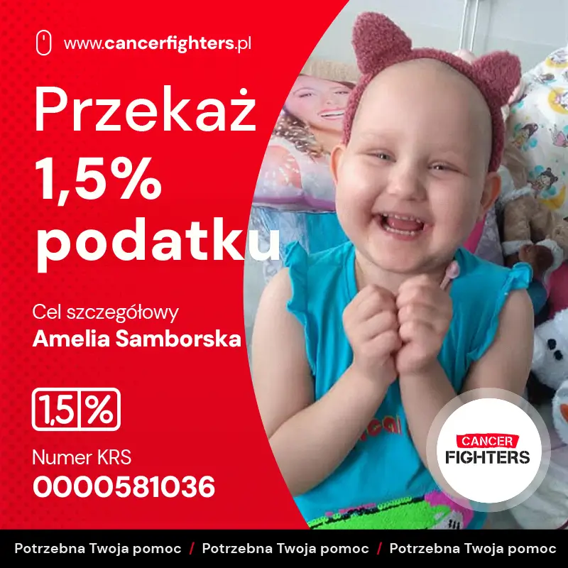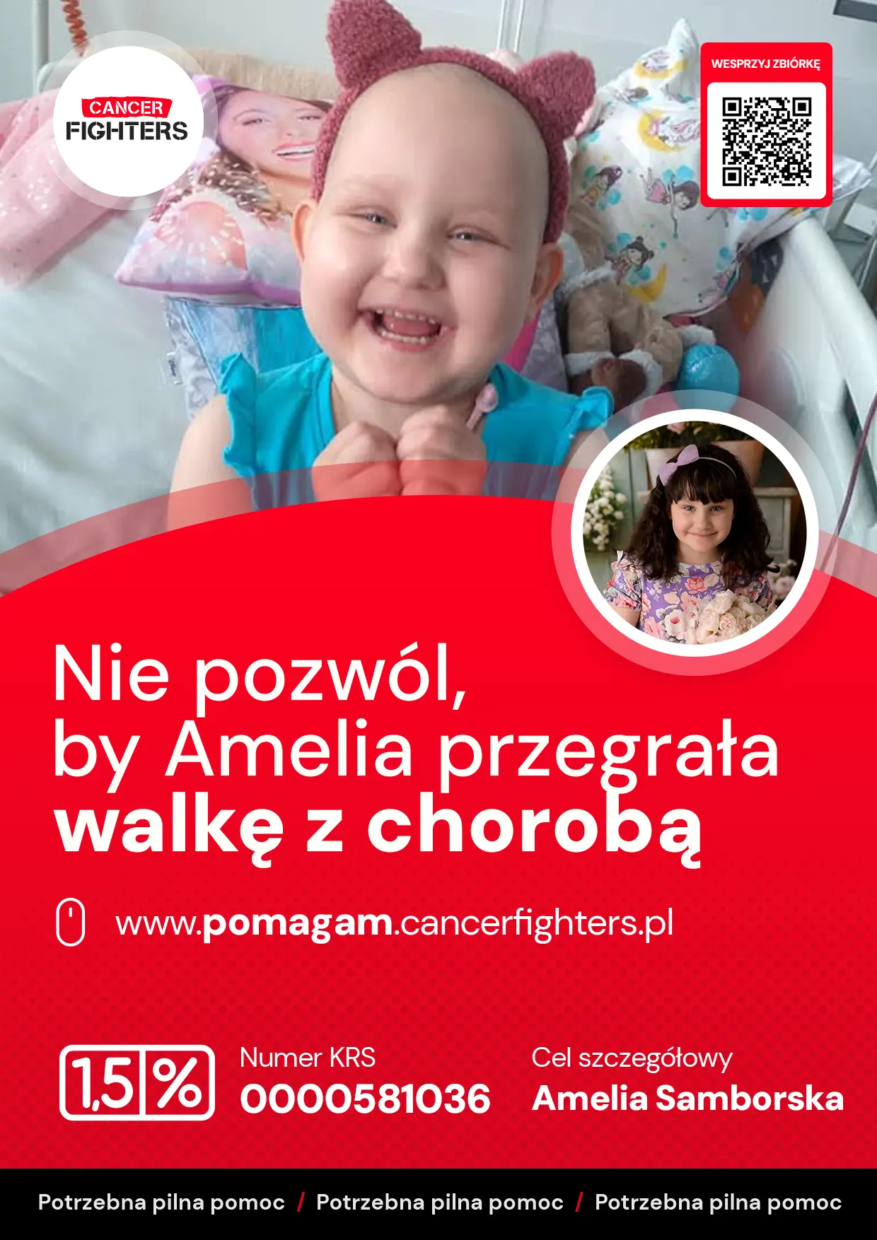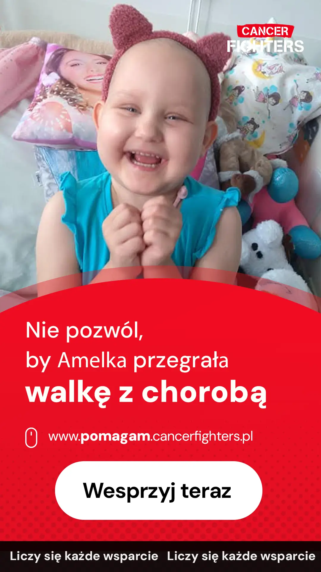Leczenie zakończyło się w lutym 2022 roku, jednak jego skutki towarzyszą Amelce do dziś. Dziewczynka pozostaje pod stałą kontrolą lekarzy w trakcie pięcioletniego okresu ochronnego i wymaga opieki wielu specjalistów z powodu powikłań neurologicznych, pulmonologicznych i pourazowych. Jedno z jej płuc działa słabiej, a długa izolacja i hospitalizacje pozostawiły ślad w postaci traumy i zaległości edukacyjnych. Mama całkowicie poświęciła się opiece nad córką, tata utrzymuje rodzinę, a młodszy brat bardzo przeżywa chorobę siostry. Amelka ma dziś dziewięć lat, kocha taniec, śpiew i zabawę – a w jej oczach wciąż widać siłę dziecka, które przeszło więcej, niż powinno, i które zasługuje na spokojne, bezpieczne dzieciństwo.