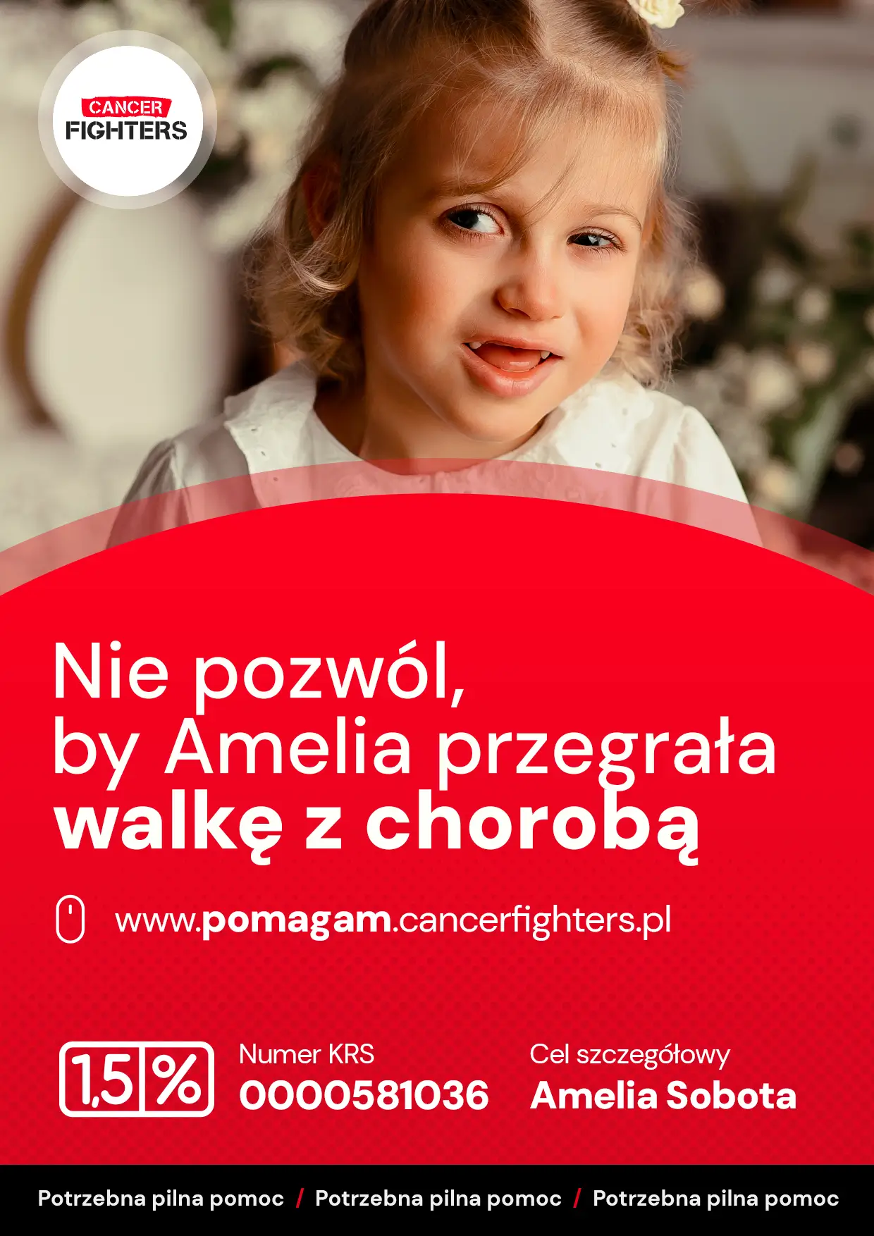 Amelia jest po zakończonym leczeniu guza Wilmsa. Obecnie znajduje się w trakcie rekonwalescencji i stopniowego powrotu do zdrowia pod stałą kontrolą lekarzy.
