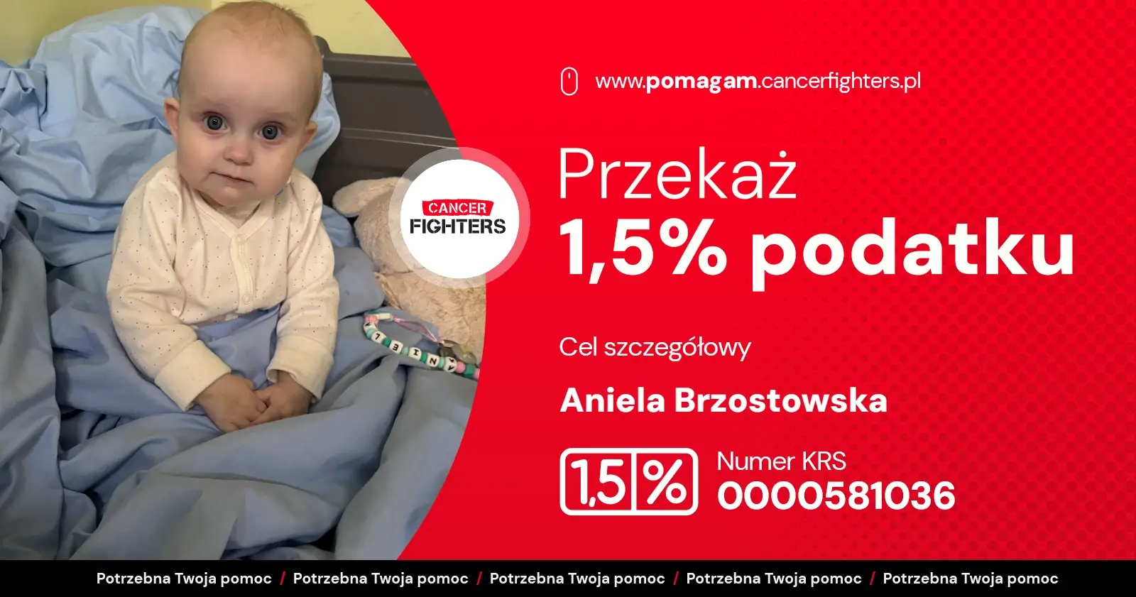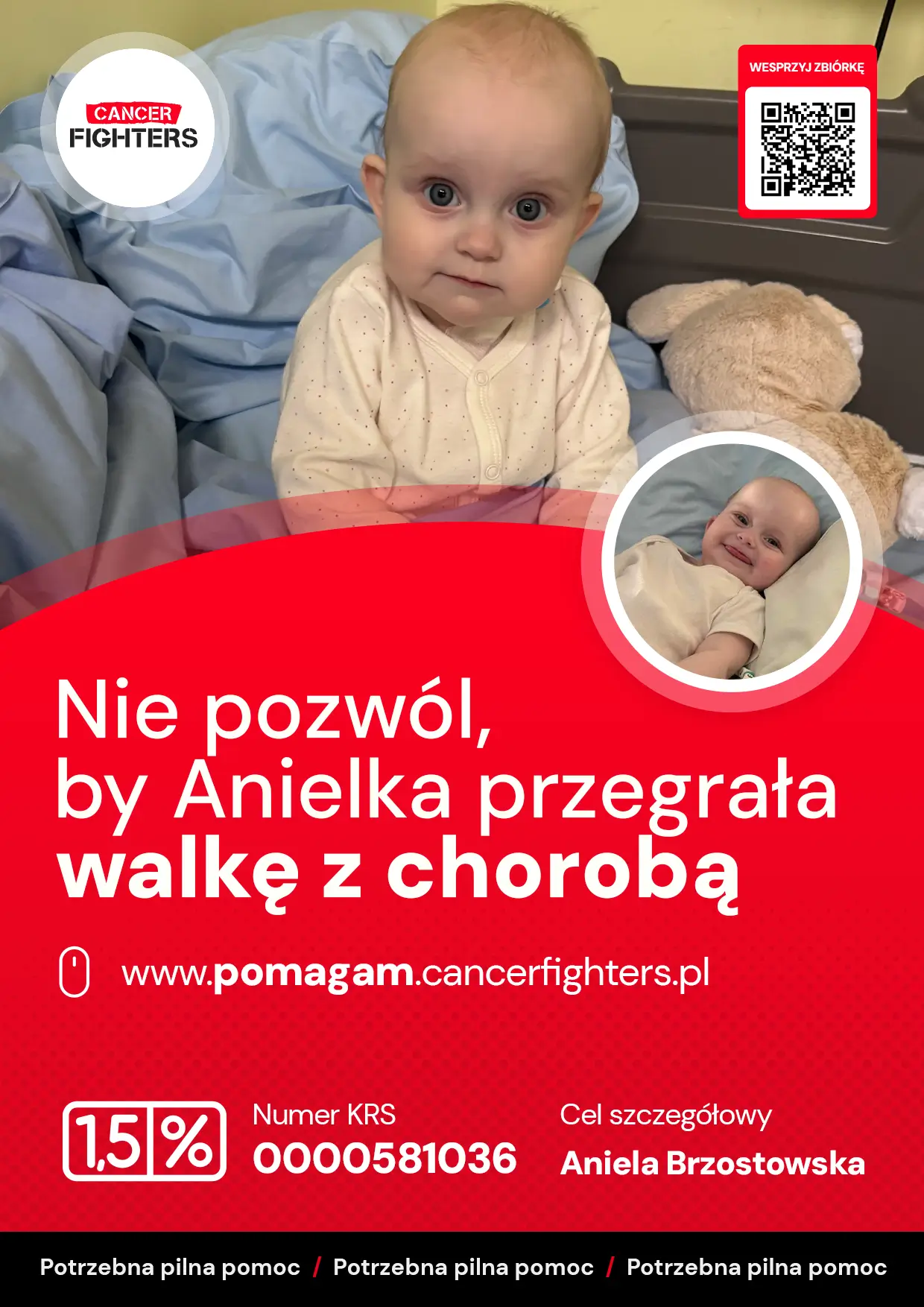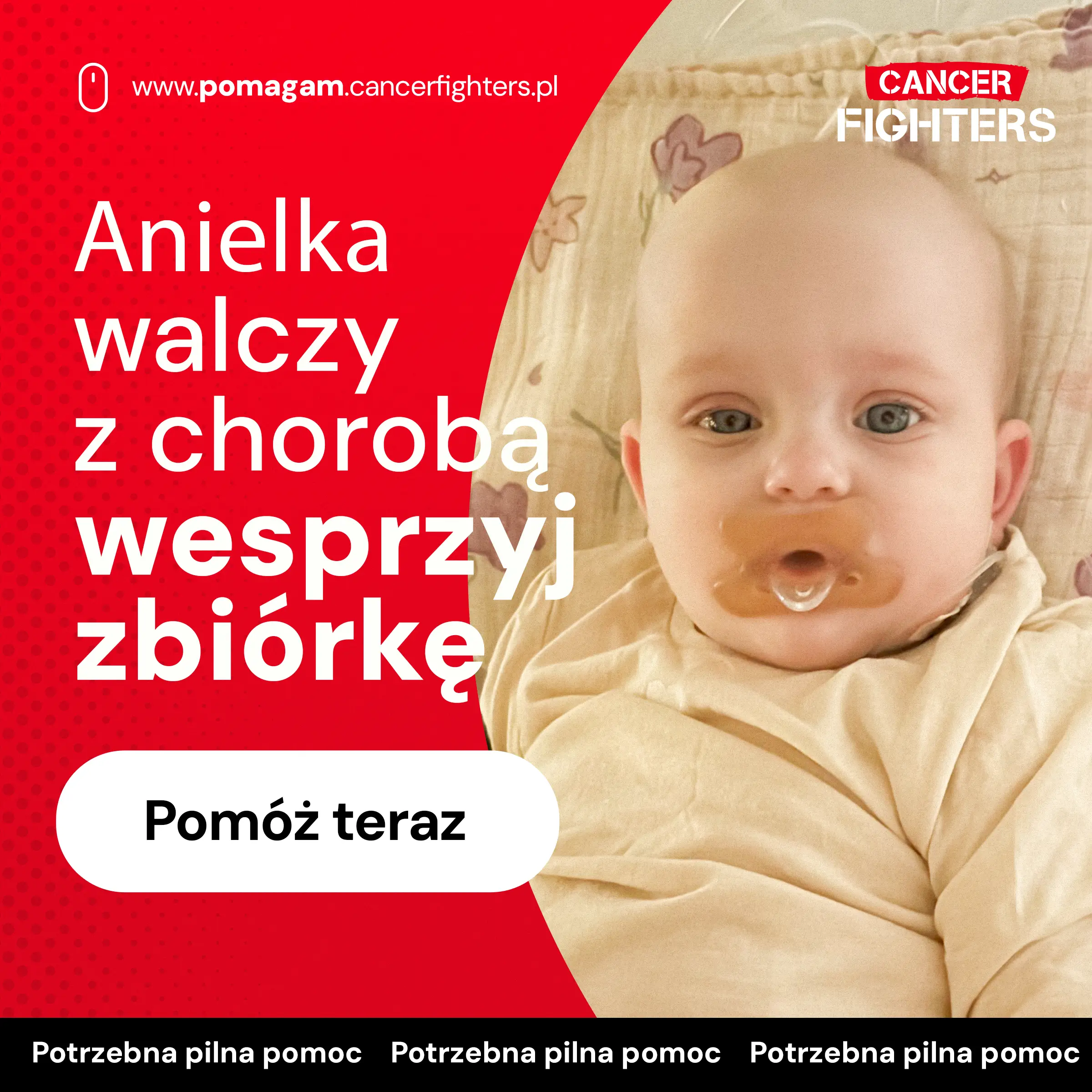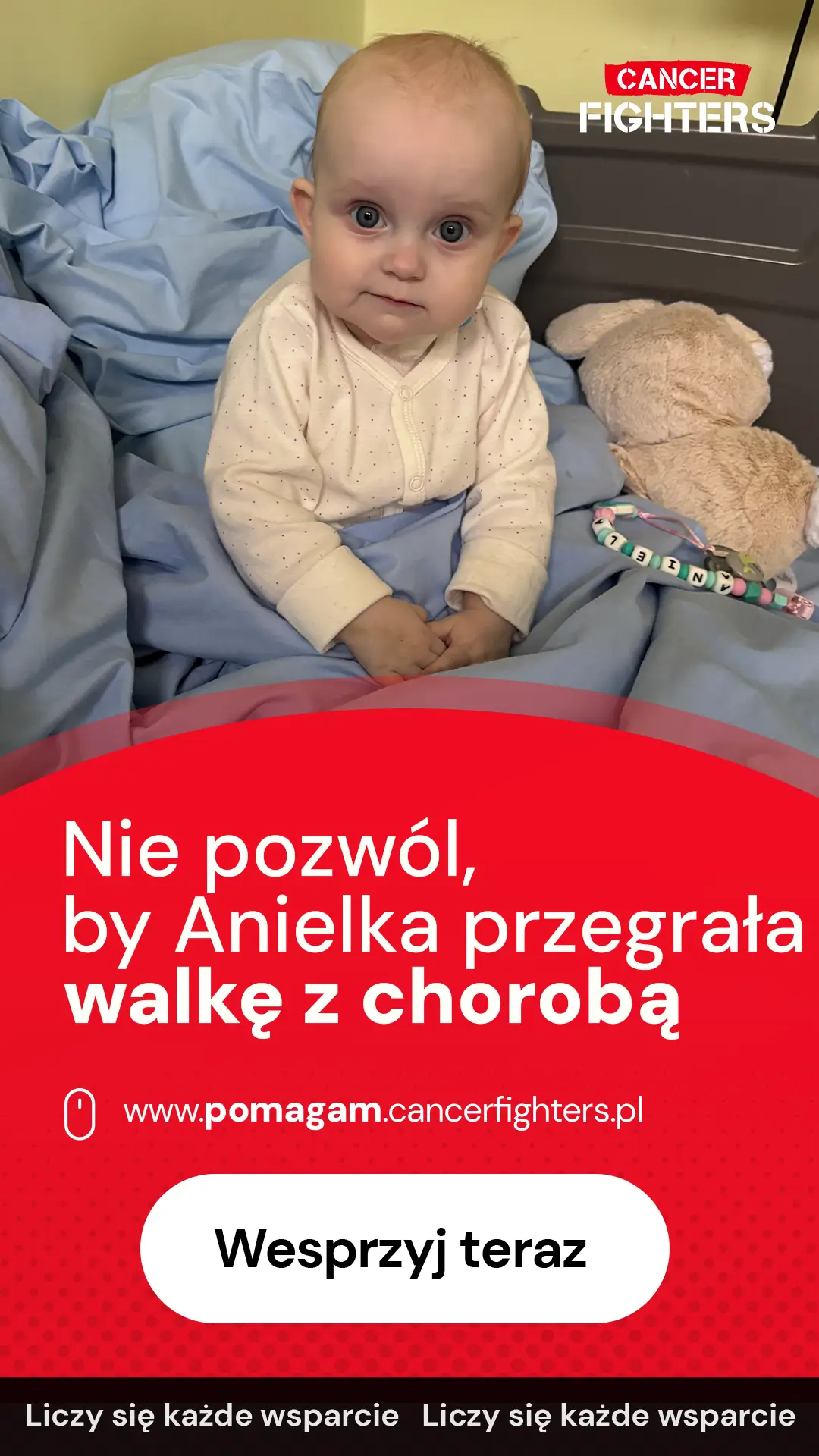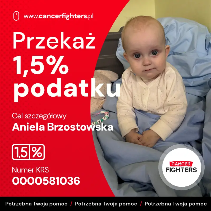 Anielka rozpoczęła leczenie według schematu C5VD, obejmującego sześć cykli chemioterapii. Początkowo terapia przebiegała stabilnie, jednak po krótkim wypisie do domu doszło do groźnych powikłań — zakażenia portu do chemioterapii, wysokiej gorączki, wymiotów i biegunki, co wymagało pilnej interwencji i wkłucia centralnego. Mama przebywa z córką w szpitalu we Wrocławiu, tata codziennie dojeżdża, a dziadkowie opiekują się trzyipółletnim bratem Anielki, który tęskni za rodziną. Leczenie prowadzone ponad dwieście kilometrów od domu generuje ogromne koszty — dojazdów, nierefundowanych leków, rehabilitacji i opieki medycznej. Anielka ma zaledwie osiem miesięcy i całe życie przed sobą — Twoje wsparcie może realnie pomóc jej rodzinie przetrwać ten czas i dać jej szansę na przyszłość.