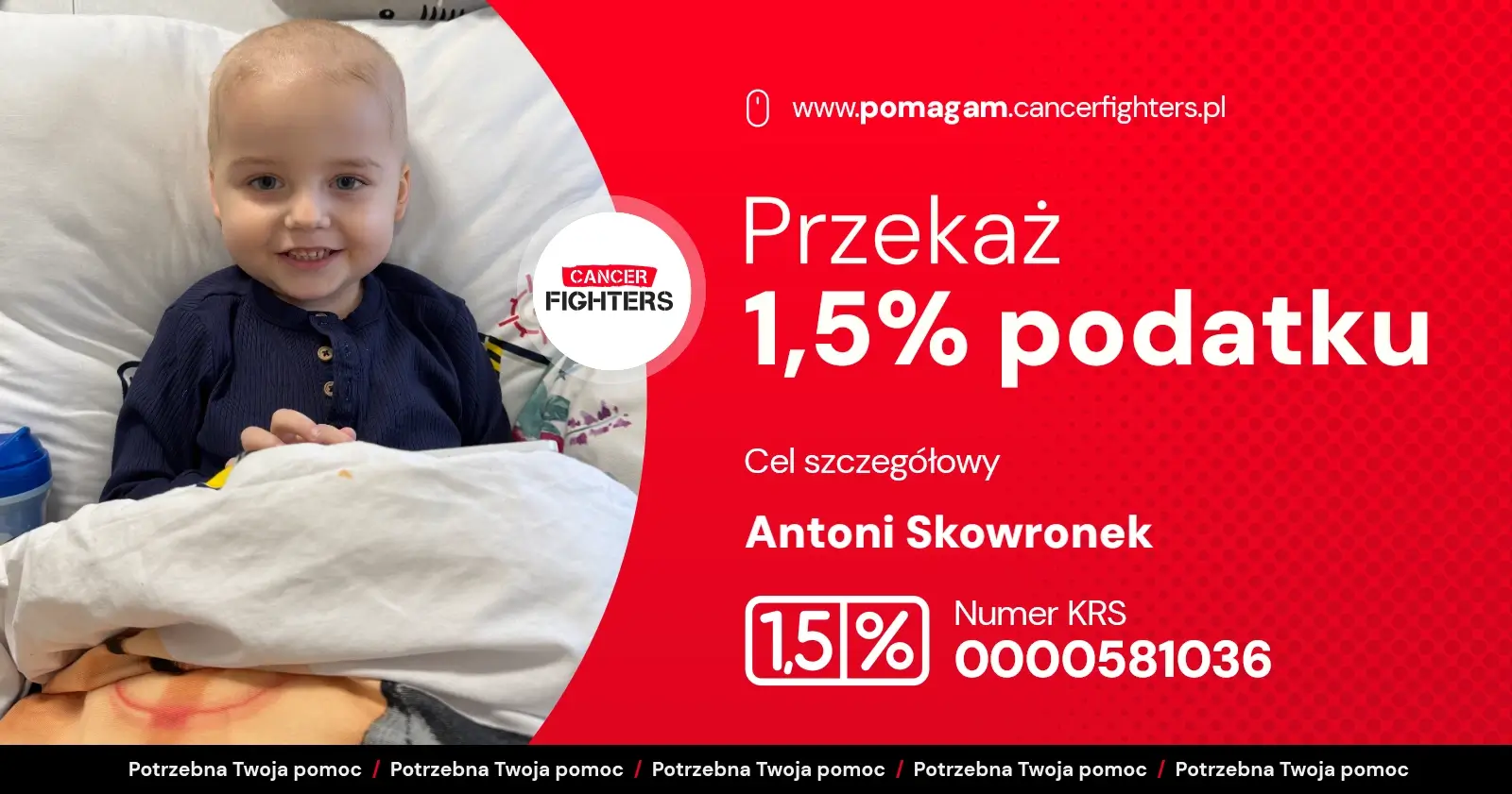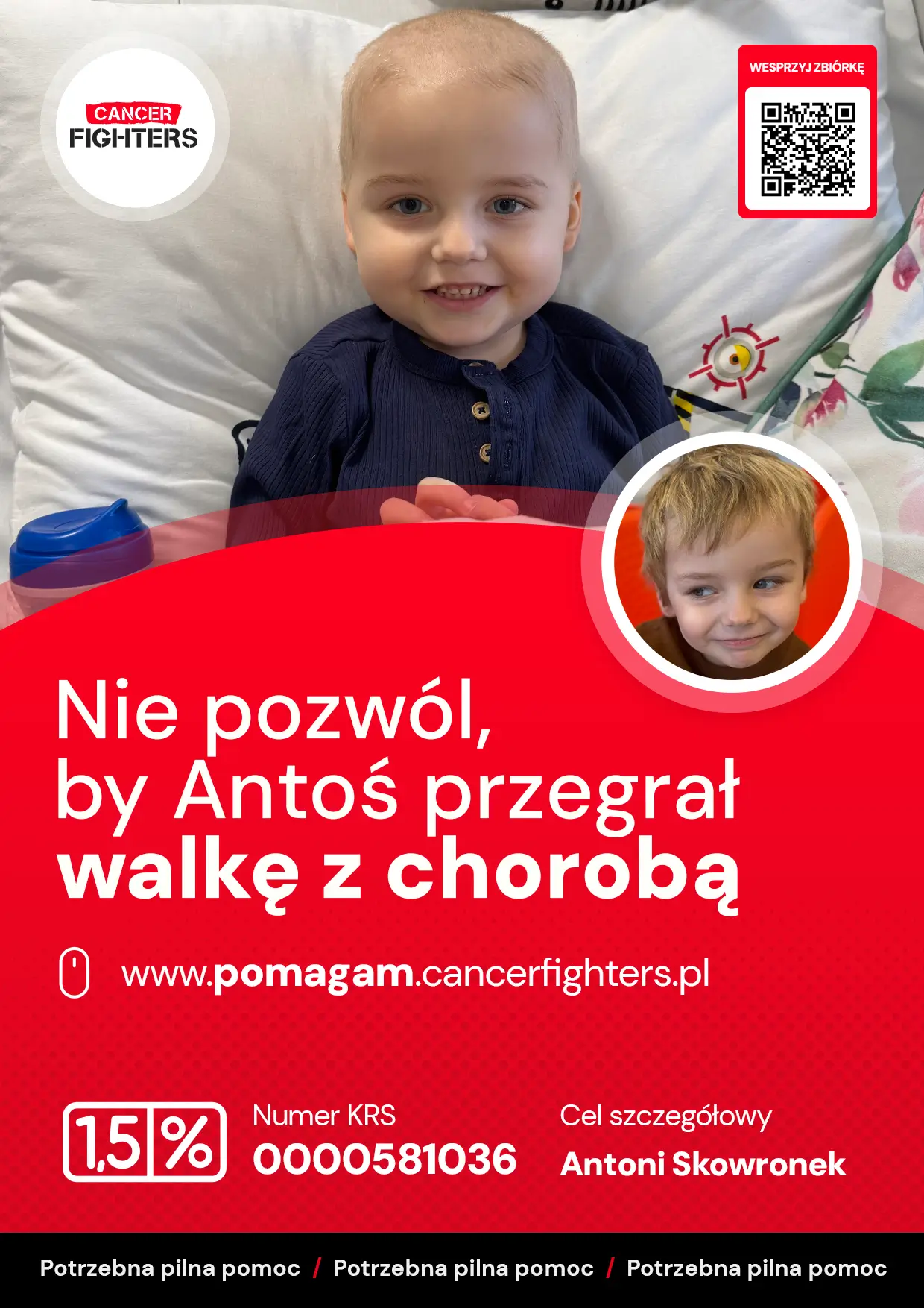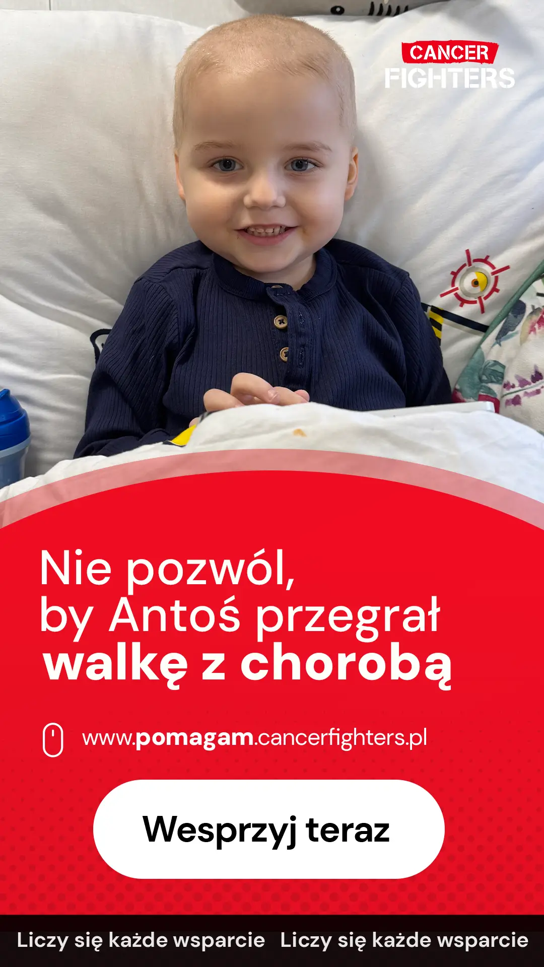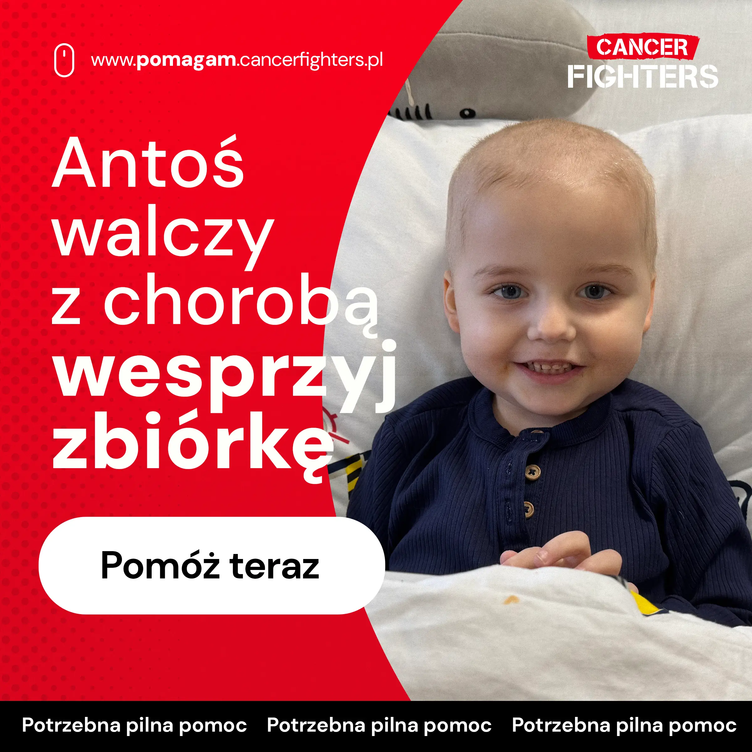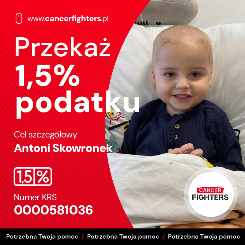 Jeszcze niedawno życie Antoniego i jego rodziny było zwyczajne – przedszkole, dom, zabawa i plany na przyszłość. Na początku grudnia pojawiły się jednak pierwsze niepokojące objawy: ból ramienia, nocne poty, nerwowość i bóle kostne. Diagnoza przyszła szybko i zmieniła wszystko – ostra białaczka limfoblastyczna. W grudniu 2025 i styczniu 2026 roku rozpoczęła się intensywna diagnostyka: założenie portu naczyniowego, punkcja kręgosłupa i biopsja szpiku, a codziennością stał się szpital w Olsztynie oraz leczenie według protokołu AIEOP-BFM 2017 Poland. Terapia już przyniosła powikłania infekcyjne i neutropenię, a ostatnie wyniki z 33. dnia leczenia pokazały utrzymującą się chorobę resztkową, co oznacza konieczność wzmocnienia i jeszcze bardziej obciążającej chemioterapii.