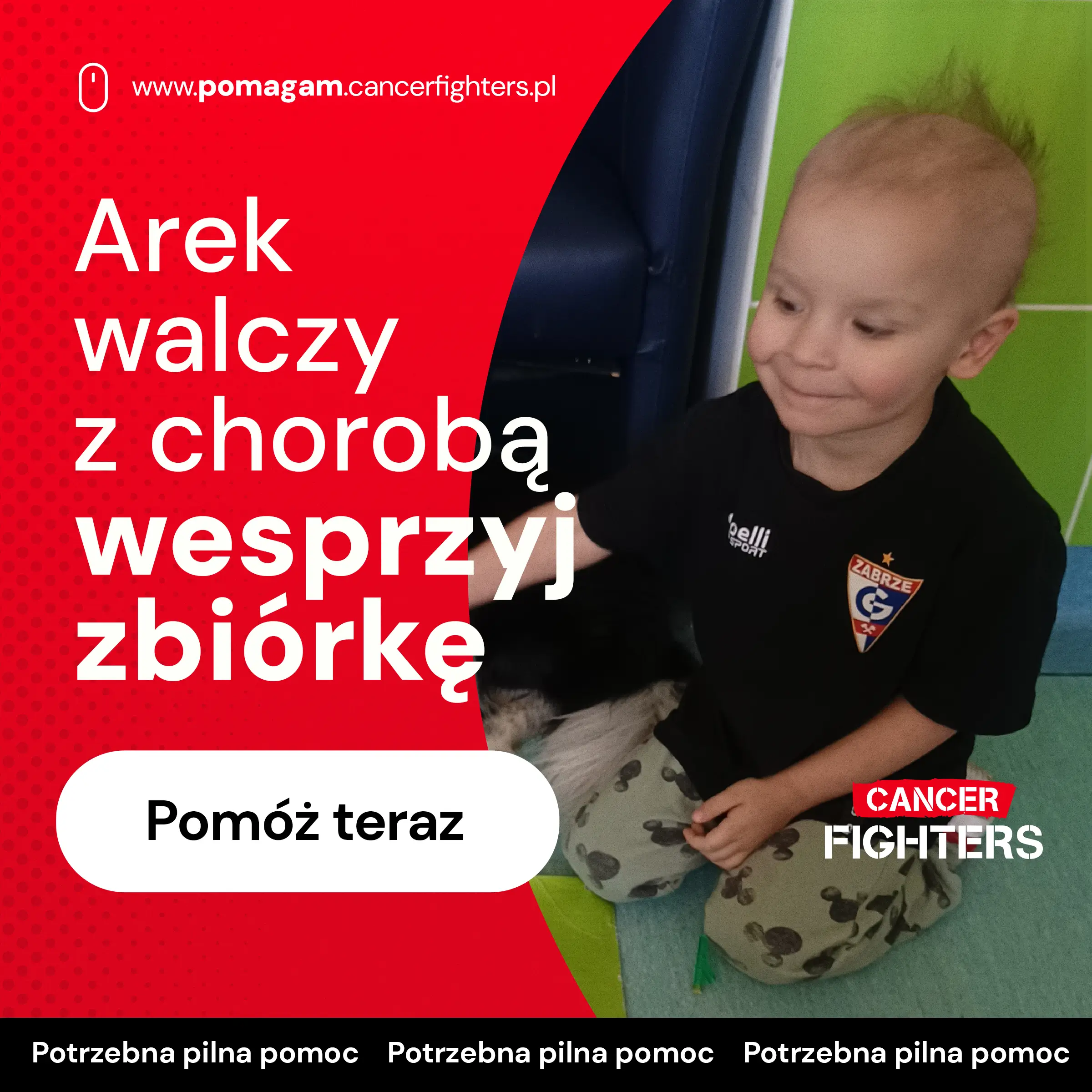 Historia choroby Arka zaczęła się 6 marca 2022 roku, gdy nagle przestał stawać na jedną nóżkę. Szybka wizyta na SOR zakończyła się diagnozą nowotworu kości i rozpoczęciem leczenia onkologicznego – pierwszą chemię otrzymał już 2 kwietnia. Terapia trwała do lipca 2023 roku, a kilka miesięcy remisji dało rodzinie nadzieję na normalność. Niestety 10 grudnia 2023 roku przyszła kolejna druzgocąca informacja – wznowa wieloogniskowej histiocytozy z komórek Langerhansa. Choroba pozostawiła trwałe konsekwencje: skrócenie jednej nogi oraz astmę oskrzelową. Arek jest obecnie w trakcie chemioterapii podtrzymującej, która potrwa do końca marca, a za nim są już biopsje, dwukrotna implantacja portu i operacja usunięcia guza kości potylicznej.