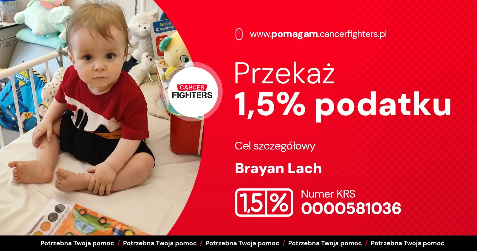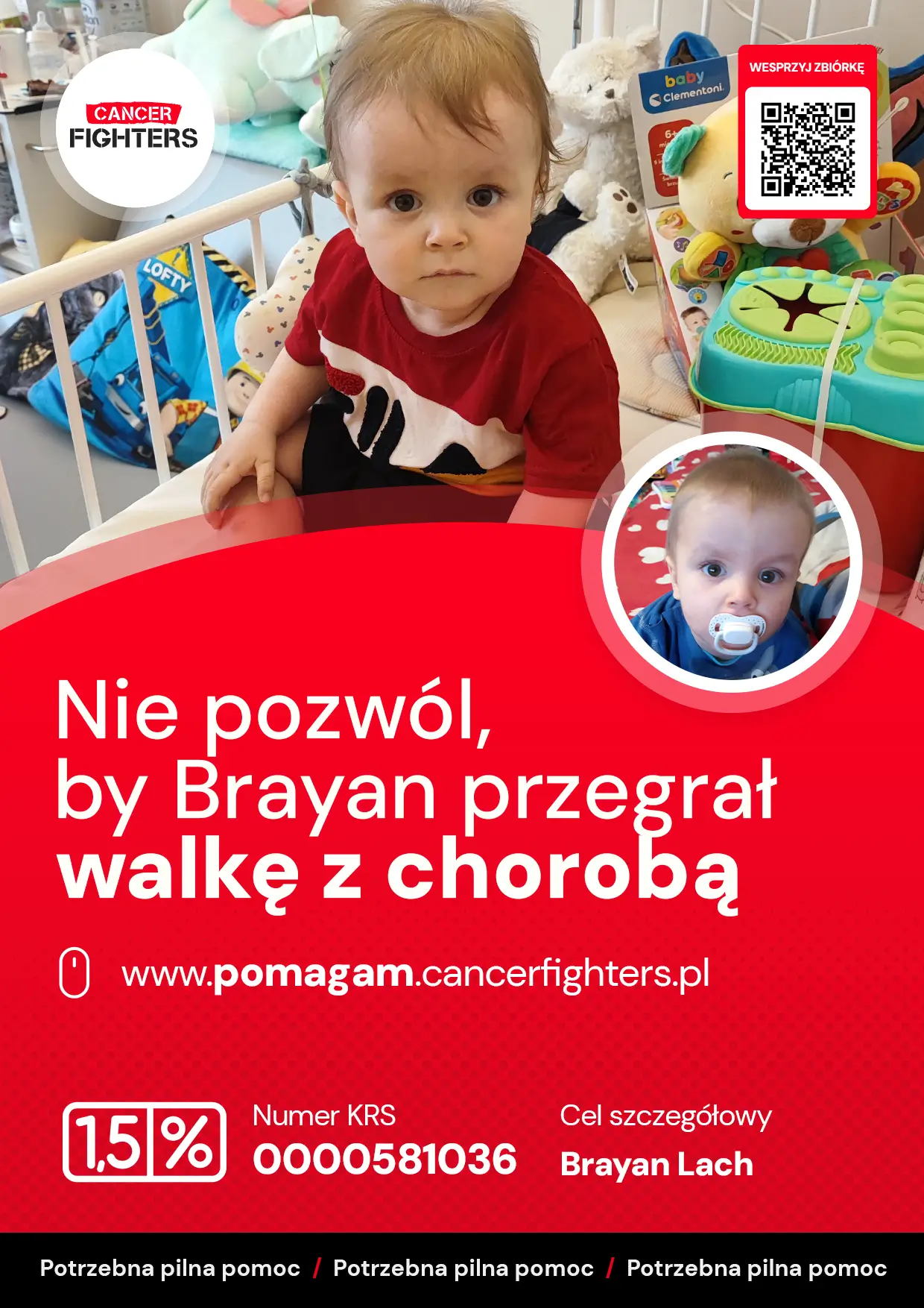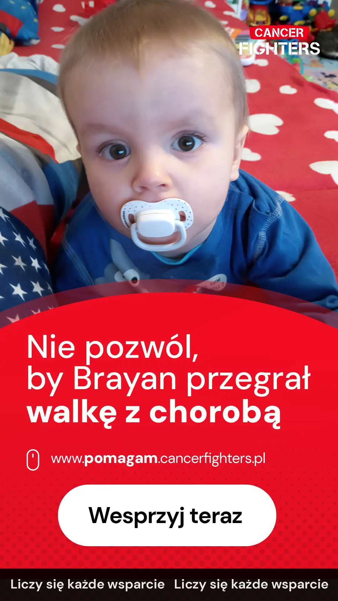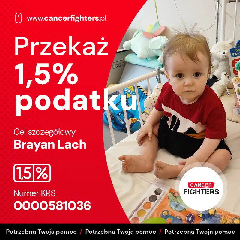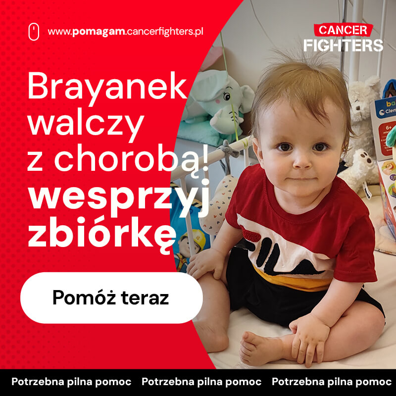 Brayan ma zaledwie rok, a już mierzy się z chorobą nowotworową, padaczką, wrodzoną wadą serca oraz nadciśnieniem spowodowanym uciskiem guza na naczynia krwionośne. Jego mały organizm dźwiga ogromny ciężar, a każdy dzień leczenia to walka o zdrowie i życie. Rodzina potrzebuje wsparcia na leki, suplementy, dojazdy do szpitala, badania poza kolejką oraz codzienne środki niezbędne w trakcie terapii. Brayan jeszcze nie potrafi opowiedzieć, co przeżywa, ale jego ciało każdego dnia pokazuje, jak bardzo ta walka jest prawdziwa.