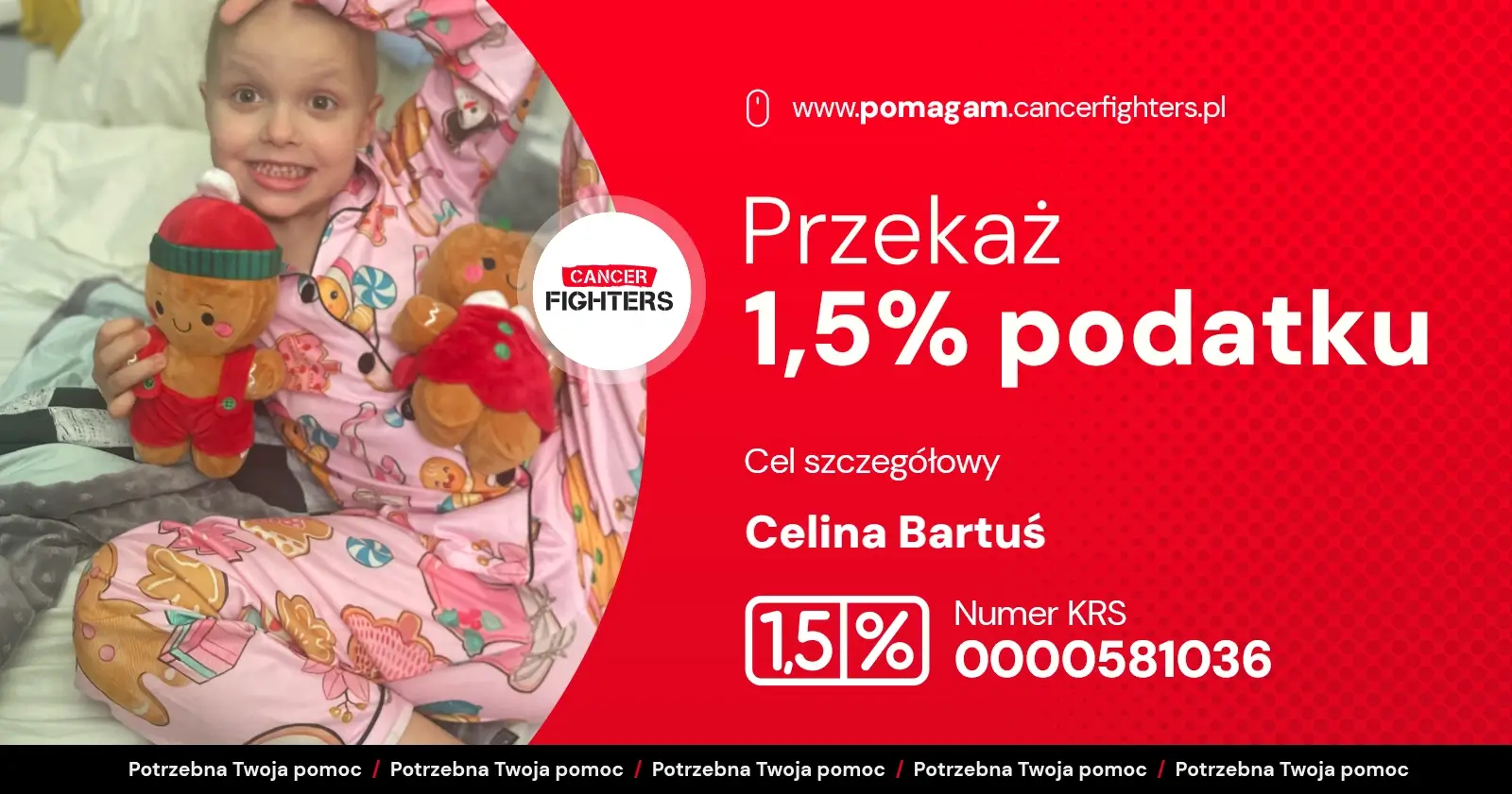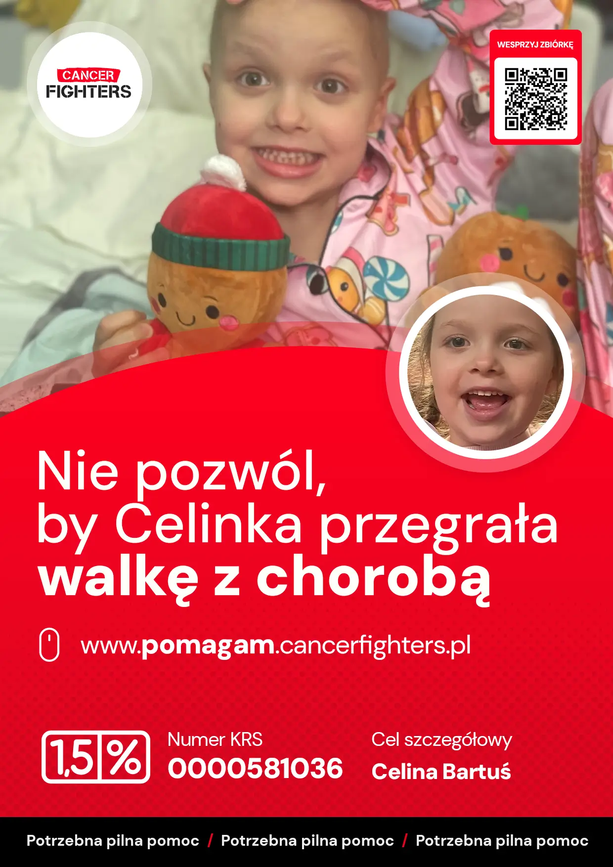 Guz zlokalizowany jest w miejscu, które utrudnia bezpieczną operację, dlatego lekarze zdecydowali o rozpoczęciu chemioterapii, mającej zmniejszyć jego rozmiar i zwiększyć szansę na mniej inwazyjny zabieg. Plan leczenia obejmuje 2–3 cykle chemii podawane co cztery tygodnie, po których zapadnie decyzja o dalszym postępowaniu chirurgicznym. Rodzina wierzy, że terapia zadziała i pozwoli uniknąć usunięcia połowy wątroby. Każde wsparcie to dla Celinki realna pomoc w walce o zdrowie, szansę na skuteczne leczenie i powrót do beztroskiego dzieciństwa.