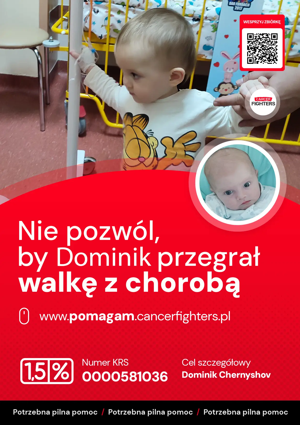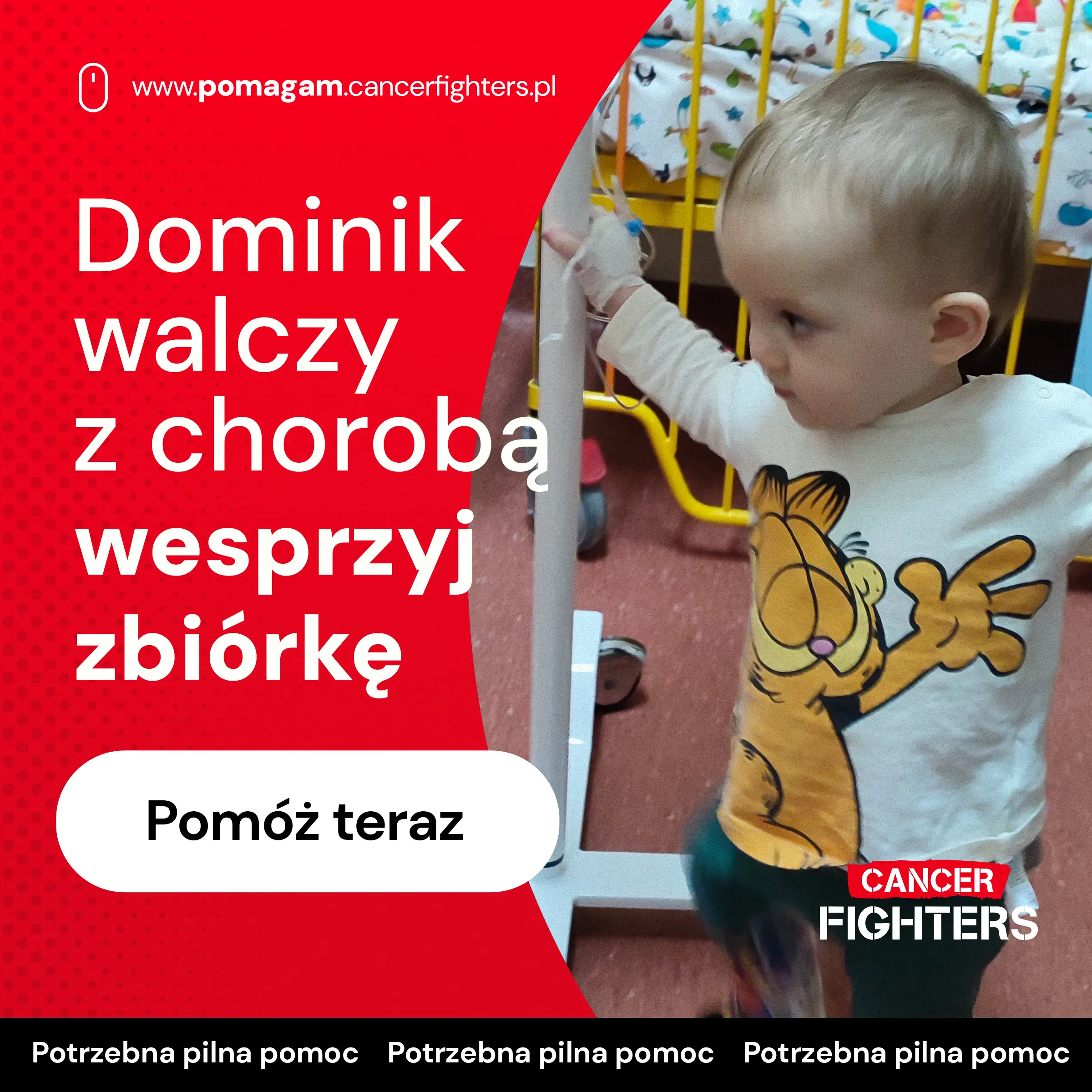 Dominik przyszedł na świat z guzem przechodzącym przez kręgosłup do jamy brzusznej, który uciskał nerwy i od pierwszych chwil życia powodował poważne zaburzenia neurologiczne. Bezwładna lewa stopa zwróciła uwagę lekarzy i zapoczątkowała natychmiastową diagnostykę. Diagnoza była druzgocąca – neuroblastoma, złośliwy nowotwór układu nerwowego. Najtrudniejsze okazały się pierwsze miesiące życia chłopca, podczas których przeszedł aż pięć poważnych operacji oraz intensywne leczenie, które musiało zostać wdrożone bez chwili zwłoki.