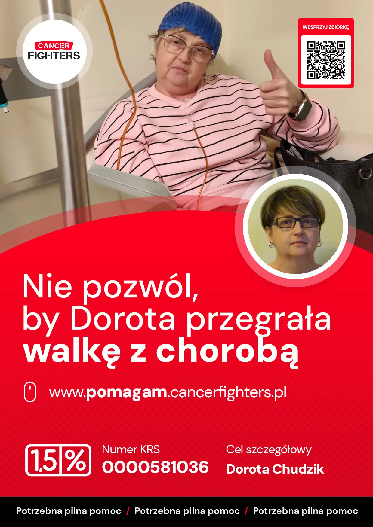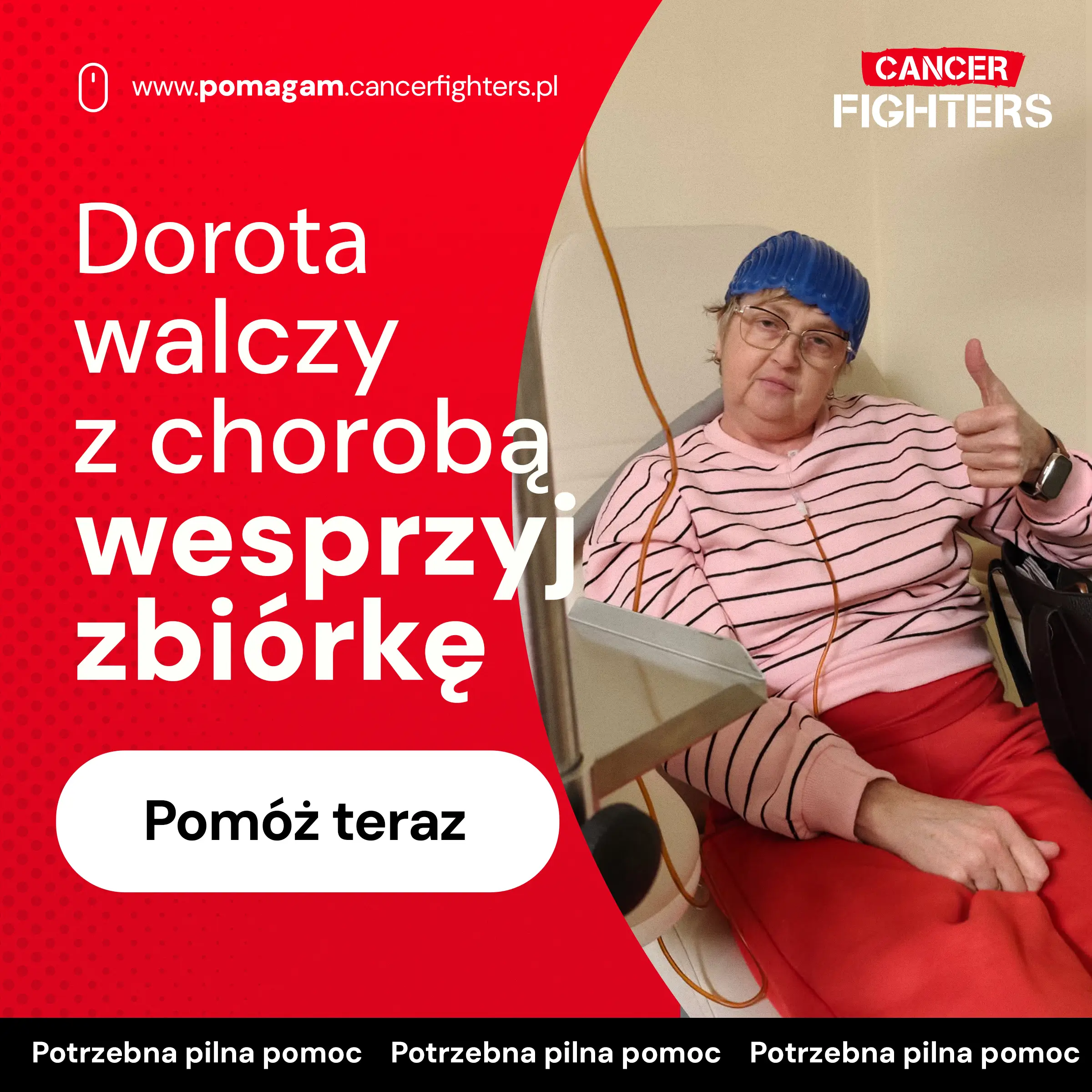 Codzienność Doroty to nie tylko walka z nowotworem, ale także z wieloma innymi chorobami — ziarniniakowatością Wegenera, cukrzycą insulinozależną, nadciśnieniem, hiperlipidemią i niedoczynnością tarczycy. Każdy dzień wymaga od niej ogromnego wysiłku, nawet najprostsze czynności stały się wyzwaniem. Organizm jest osłabiony, a ból i zmęczenie towarzyszą jej nieustannie. Nie może wrócić do pracy, a świat za oknem — zwykły, codzienny — wydaje się coraz bardziej odległy. Dodatkowym obciążeniem są częste podróże do Warszawy, każda z nich to 300 kilometrów zmęczenia i walki, która zaczyna się jeszcze przed przekroczeniem progu szpitala. W tej sytuacji wsparcie ma ogromne znaczenie — pozwala Dorocie skupić się na tym, co najważniejsze: leczeniu i odzyskiwaniu sił, krok po kroku.