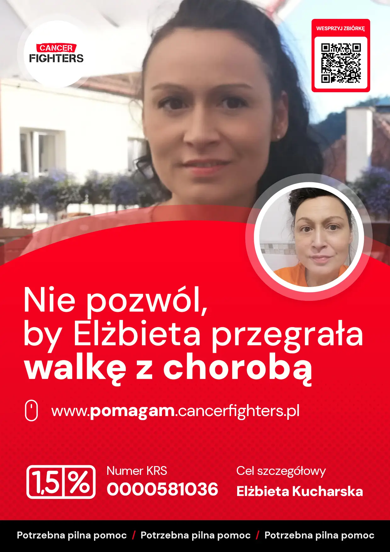 Z powodu pogorszenia stanu zdrowia Elżbieta od około roku nie może pracować, a zgromadzone wcześniej oszczędności zostały już wykorzystane. Rosnące koszty leczenia i brak stabilności finansowej stały się dodatkowym źródłem stresu, zwłaszcza że musi troszczyć się o bezpieczeństwo domu, w którym dorasta jej córka. Choroba dotyka całą rodzinę, jednak mąż i dziecko pozostają dla niej najważniejszym wsparciem i motywacją do dalszej walki. Codzienność naznaczona jest bólem, kolejnymi etapami terapii i niepewnością jutra, dlatego pomoc innych może realnie odciążyć rodzinę i pozwolić Elżbiecie skupić się na leczeniu oraz odzyskiwaniu sił. Każdy dzień jest dla niej próbą utrzymania równowagi między chorobą a troską o najbliższych, a okazane wsparcie może pomóc jej zachować nadzieję i energię do dalszego życia.