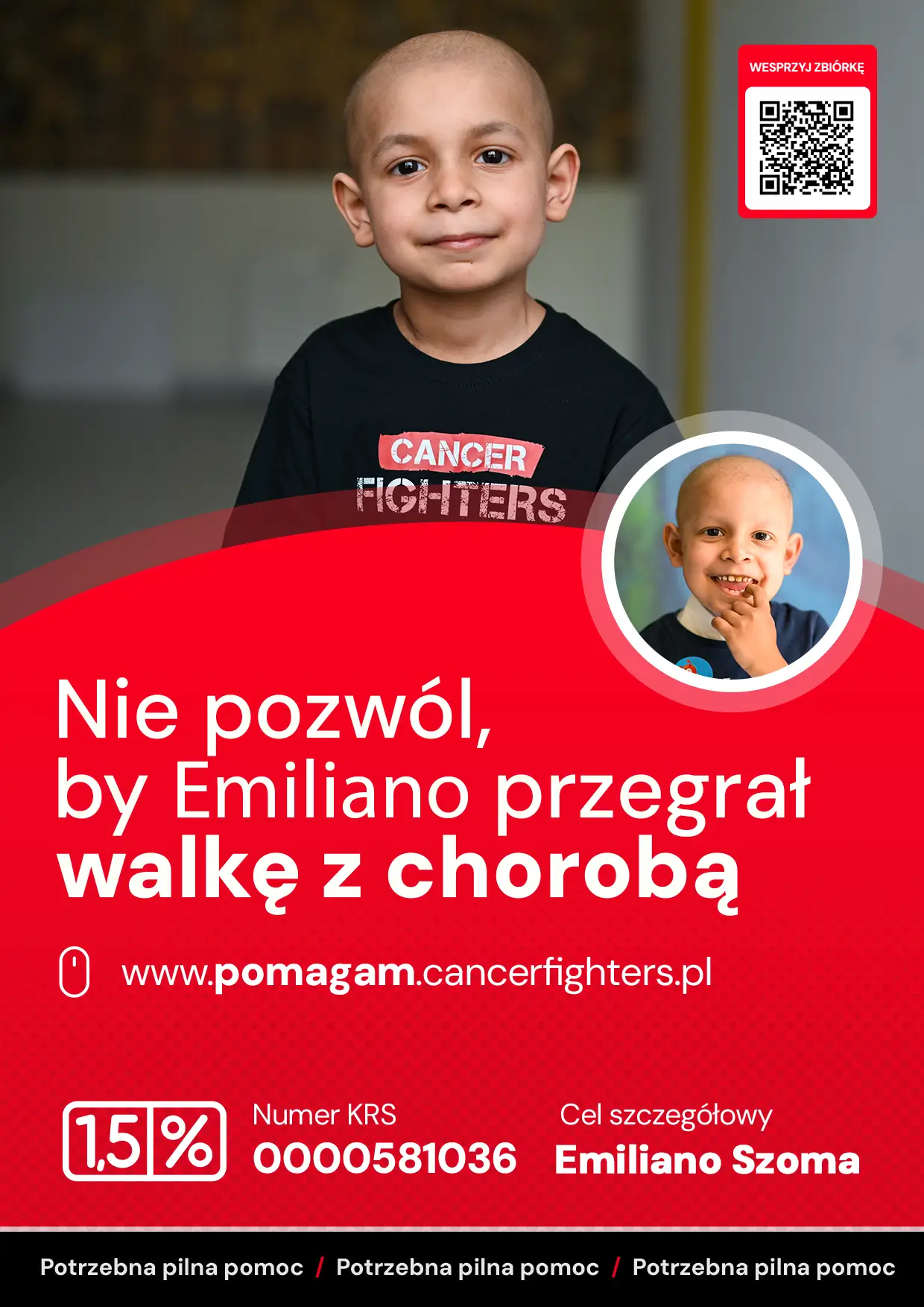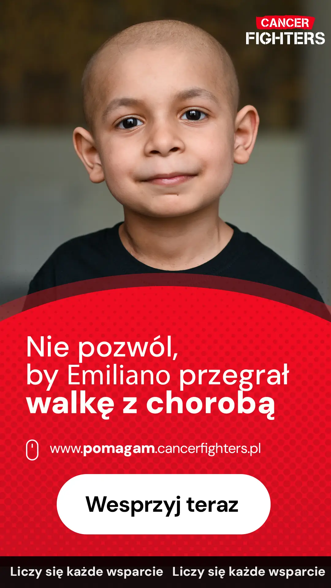 Wszystko zaczęło się w lutym 2024 roku od pozornie niegroźnego urazu prawego barku podczas zwykłej zabawy. W kolejnych dniach nad obojczykiem pojawił się duży guz, który początkowo nie wzbudził poważnych obaw lekarzy i był leczony jak stan zapalny. Gdy stan Emiliano gwałtownie się pogorszył, chłopiec trafił do „Przylądka Nadziei” we Wrocławiu, gdzie biopsja ujawniła bardzo złośliwy nowotwór. Guz uciska nerwy barkowe, powodując niedowład prawej rączki. Natychmiast rozpoczęto intensywne leczenie onkologiczne, które Emiliano znosi z ogromną dzielnością. Obecnie wraz z rodziną czeka na operację guza oraz przeszczep, a każda forma wsparcia jest dla nich realną pomocą w tej trudnej, nierównej walce.