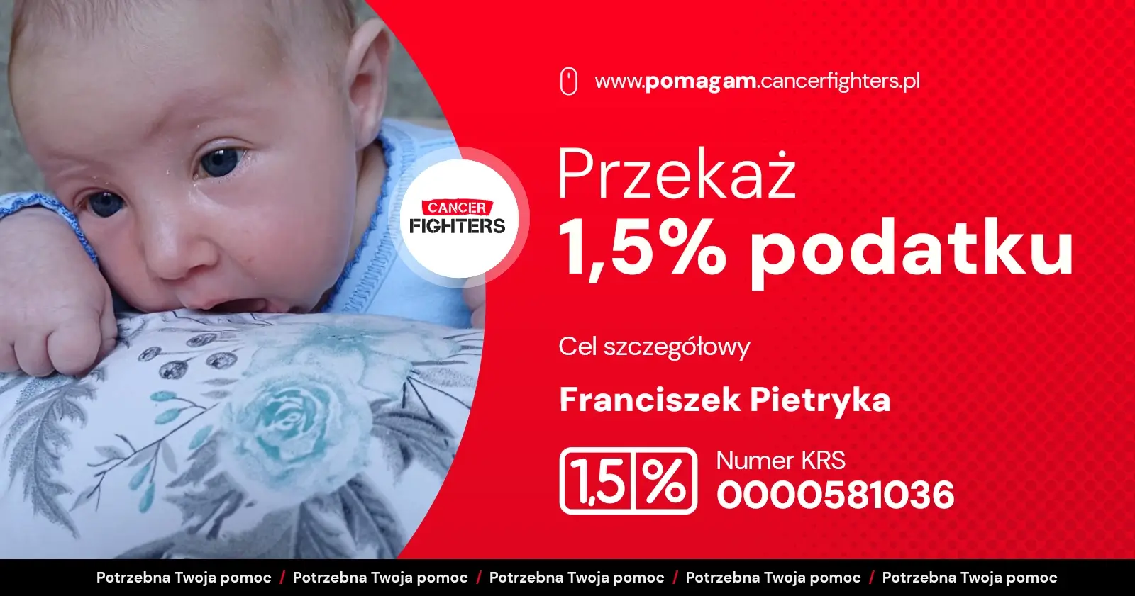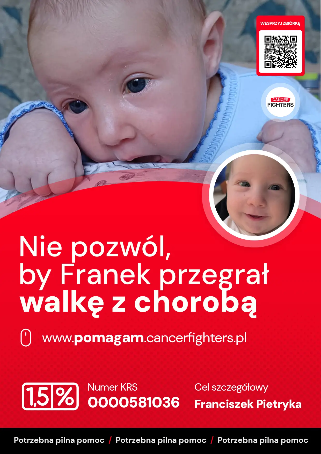 Franciszek przyszedł na świat w październiku 2025 roku, a niewielką zmianę na łopatce uznano początkowo za naczyniaka wymagającego jedynie obserwacji. Gdy jednak zmiana zaczęła szybko rosnąć i krwawić, rozpoczęła się seria hospitalizacji, badań i prób leczenia propranololem, które nie przyniosły efektu. W połowie stycznia wykonano biopsję, a rodzice trzymiesięcznego Frania usłyszeli druzgocącą diagnozę – mięsak, złośliwy nowotwór tkanek miękkich klatki piersiowej. Od tamtej pory chłopiec przebywa w szpitalu, przeszedł liczne badania, pobranie szpiku, transfuzje krwi i aż sześć znieczuleń ogólnych. Trwają jeszcze specjalistyczne badania genetyczne, które pozwolą dokładnie określić typ nowotworu i dobrać leczenie celowane; na ten moment Franek otrzymuje chemioterapię podtrzymującą, a dodatkowo wykryto przerzut do węzłów pachowych.