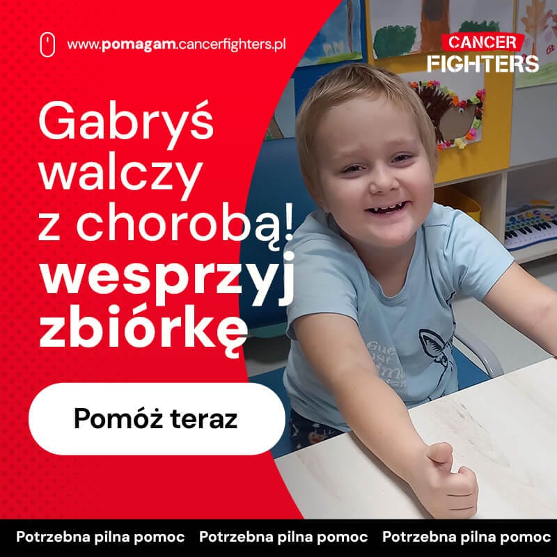 5-letni Gabryś od marca 2023 roku walczy z ostrą białaczką limfoblastyczną. Choroba objawiła się niespodziewanie – bólami nóg i osłabieniem. Po długim leczeniu szpitalnym nasz Wojownik wrócił do domu, gdzie kontynuuje terapię, przyjmując chemię podtrzymującą do kwietnia 2025 roku.