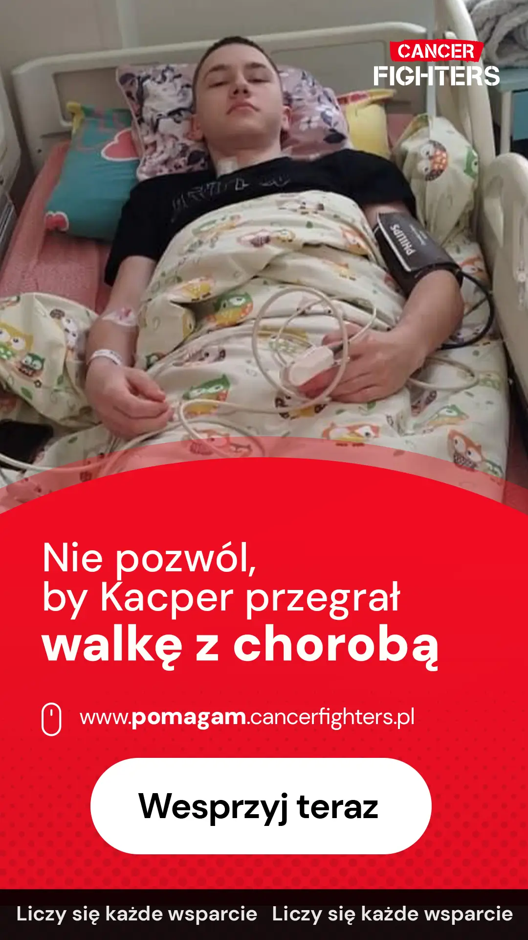 Przed Kacprem kolejny etap — operacja usunięcia kości strzałkowej, od której zależy dalszy przebieg terapii. W tej trudnej drodze nie jest sam — mama jest przy nim każdego dnia, a w domu w Kudowie tata i młodszy brat Fabian próbują odnaleźć się w nowej rzeczywistości. Fabian, tęskniąc za mamą i bratem, pozostaje pod opieką psychologa, który pomaga mu zrozumieć tę nagłą zmianę. Kacper jeszcze niedawno był pełnym energii chłopakiem, dla którego sport był codziennością — dziś mierzy się z chorobą, której nikt się nie spodziewał. Najtrudniejsze jest czekanie — na wyniki, na decyzje lekarzy, na kolejne etapy leczenia. Do tego dochodzą wyczerpujące podróże między miastami i ogromne obciążenie dla całej rodziny. Mimo wszystko trzymają się razem, a nadzieja wciąż jest obecna. W tej sytuacji każdy gest wsparcia ma realne znaczenie — pozwala skupić się na tym, co najważniejsze: zdrowiu Kacpra i wierze, że ta historia może zakończyć się dobrze.
