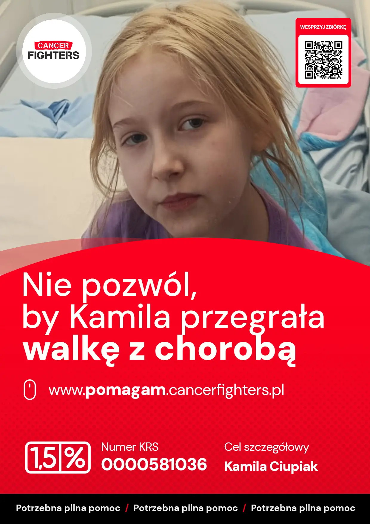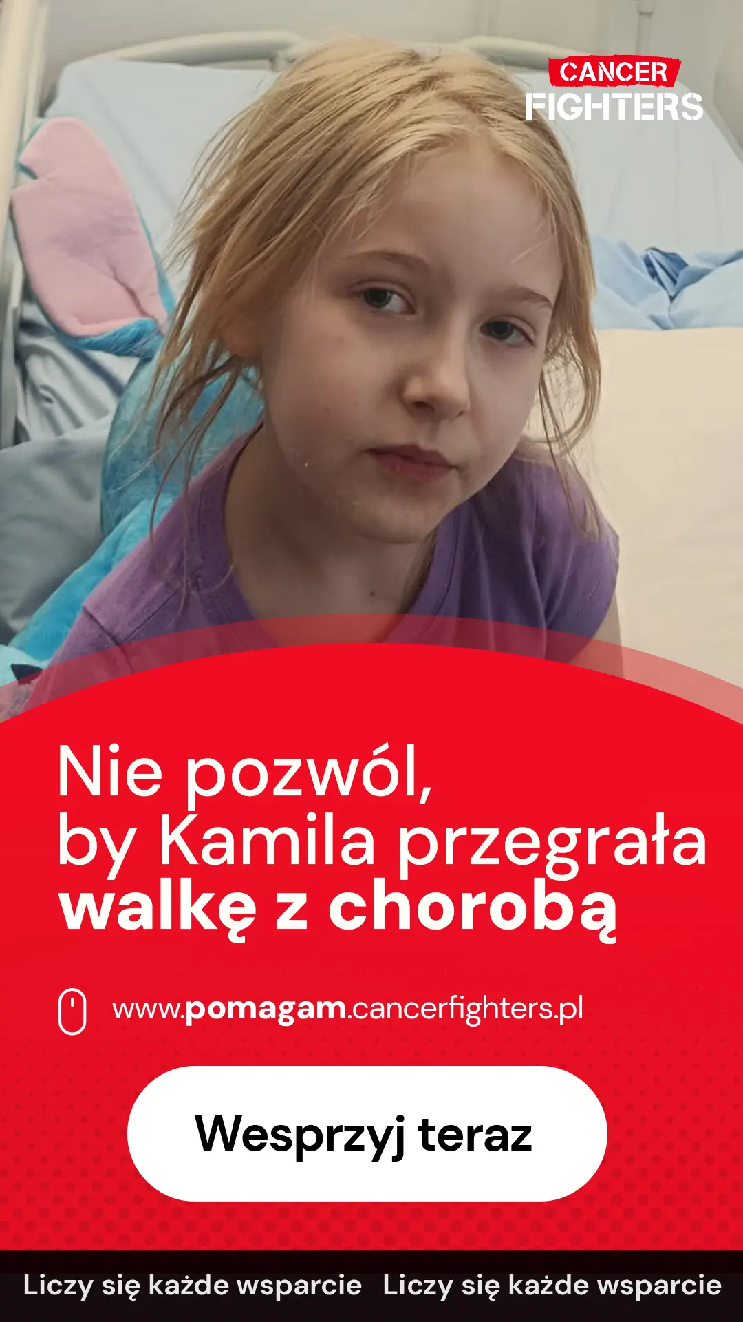 Dodatkowym wyzwaniem są zaburzenia sensoryczne dziewczynki — nadwrażliwość słuchowa i problemy z czuciem głębokim sprawiają, że każde badanie czy wkłucie wiąże się z ogromnym stresem i bólem. Mama pozostaje na zwolnieniu, by móc być przy córce, a cała rodzina żyje w nieustannym napięciu, nie wiedząc, czy choroba nie przybierze przewlekłego charakteru. Kamilka tęskni za przedszkolem, koleżankami, tatą oraz swoimi zwierzętami, a spokój odnajduje w rysowaniu, klockach LEGO i zabawie z pupilem. Dziś ich codzienność to czekanie na wyniki i próba utrzymania nadziei mimo niepewności. Każde wsparcie pomaga rodzinie iść dalej tą trudną drogą i daje szansę, by dziewczynka mogła wrócić do bezpiecznego, zwyczajnego dzieciństwa.
