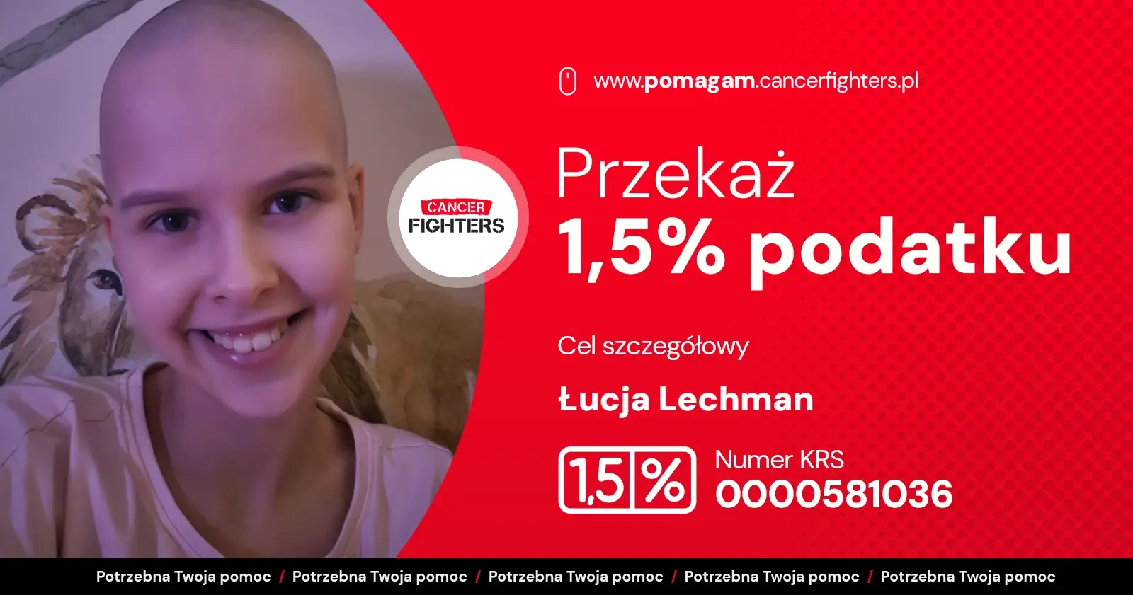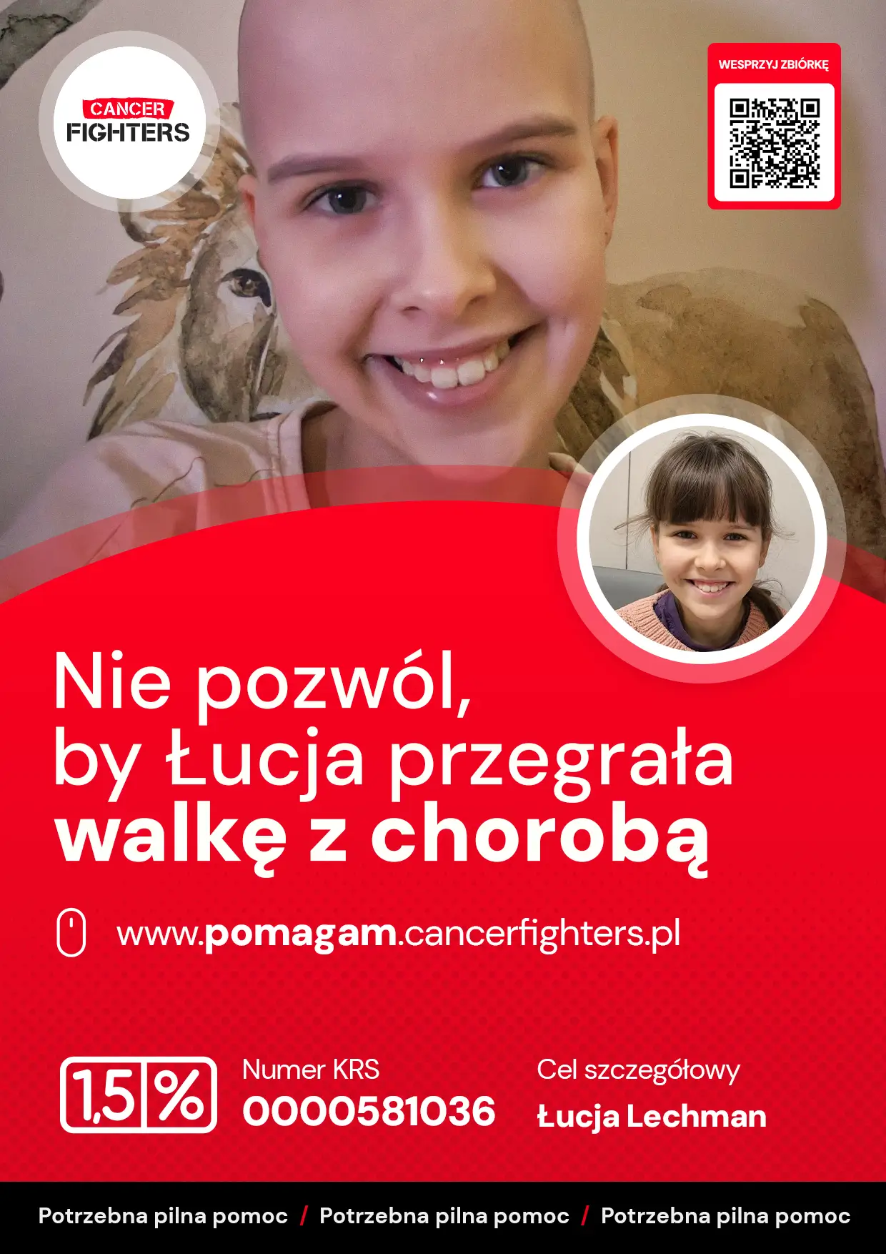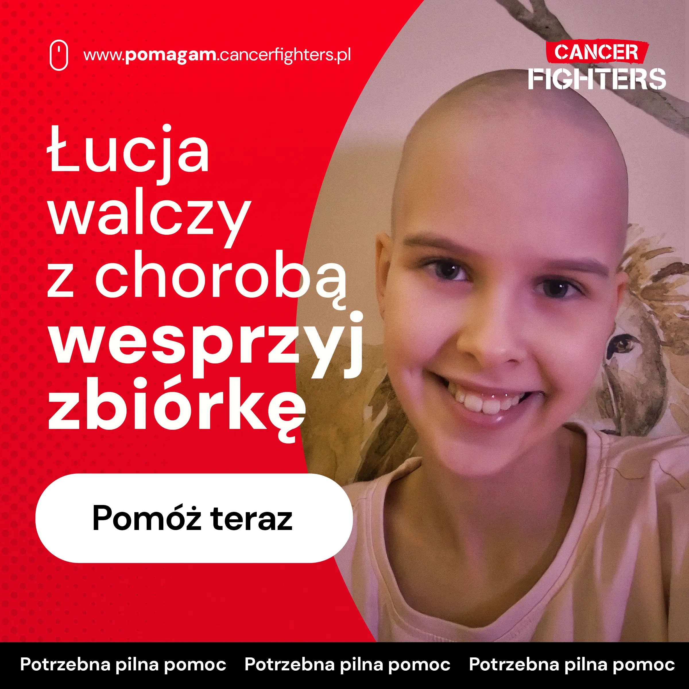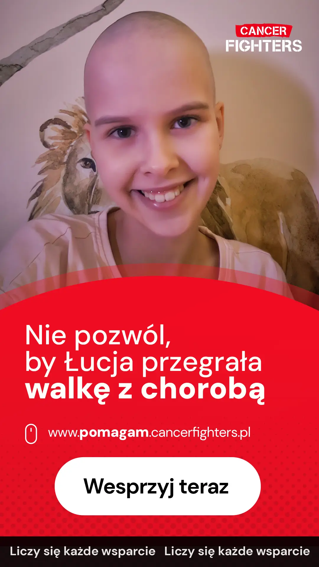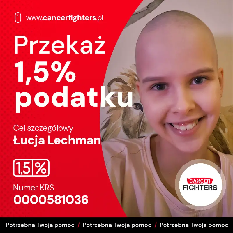 Choroba całkowicie zmieniła życie rodziny. Leczenie odbywa się setki kilometrów od domu, między Wrocławiem a Warszawą, co oznacza nieustanne podróże, rozłąkę z bliskimi i ogromne obciążenie organizacyjne oraz emocjonalne. Mama musiała zrezygnować z pracy, tata dzieli czas między szpital a opiekę nad starszym synem, a codzienność wypełniają badania, leki, czuwanie nad wagą i stanem dziecka. Łucja waży zaledwie 21 kilogramów, a przed nią długa droga do odzyskania sprawności. Mimo bólu i zmęczenia wciąż znajduje radość w tworzeniu prac plastycznych, kocha zwierzęta i marzy o tym, by znów móc biegać i wrócić do szkoły. Każde wsparcie to realna pomoc w tej trudnej walce i szansa, by Łucja mogła odzyskać dzieciństwo, które zostało tak nagle przerwane.