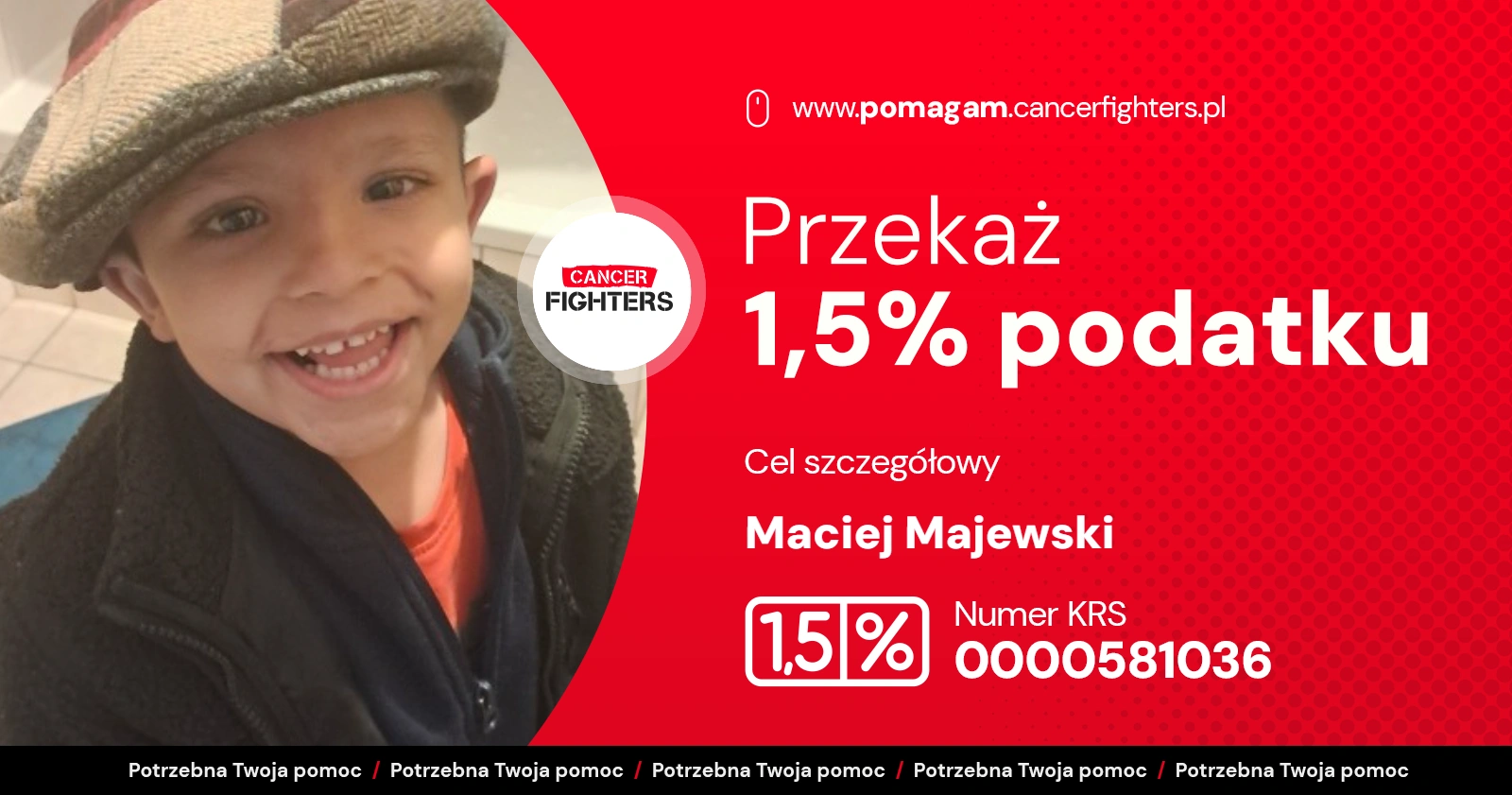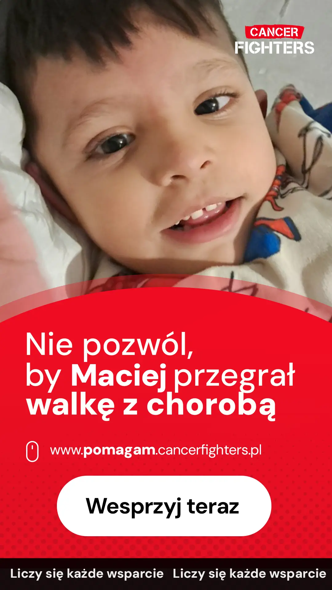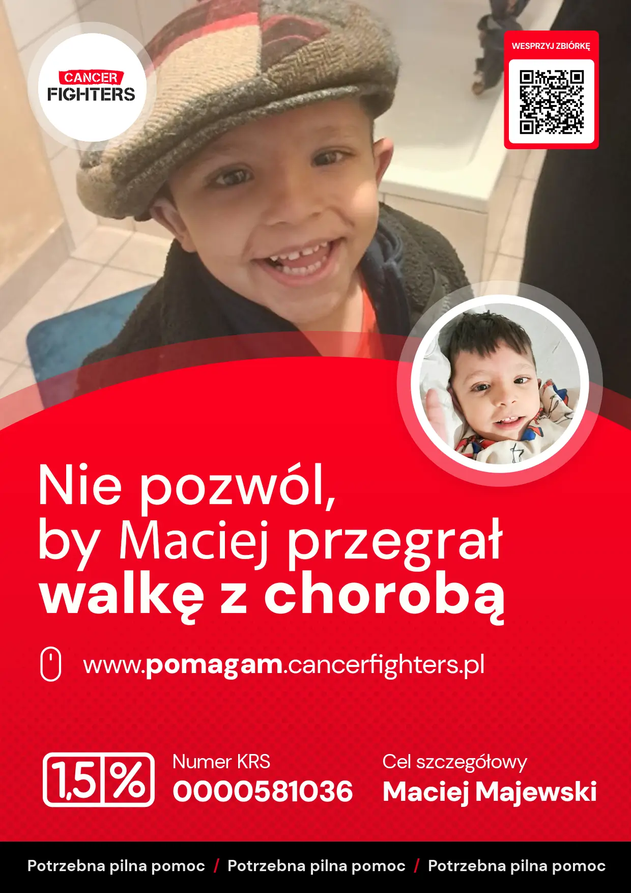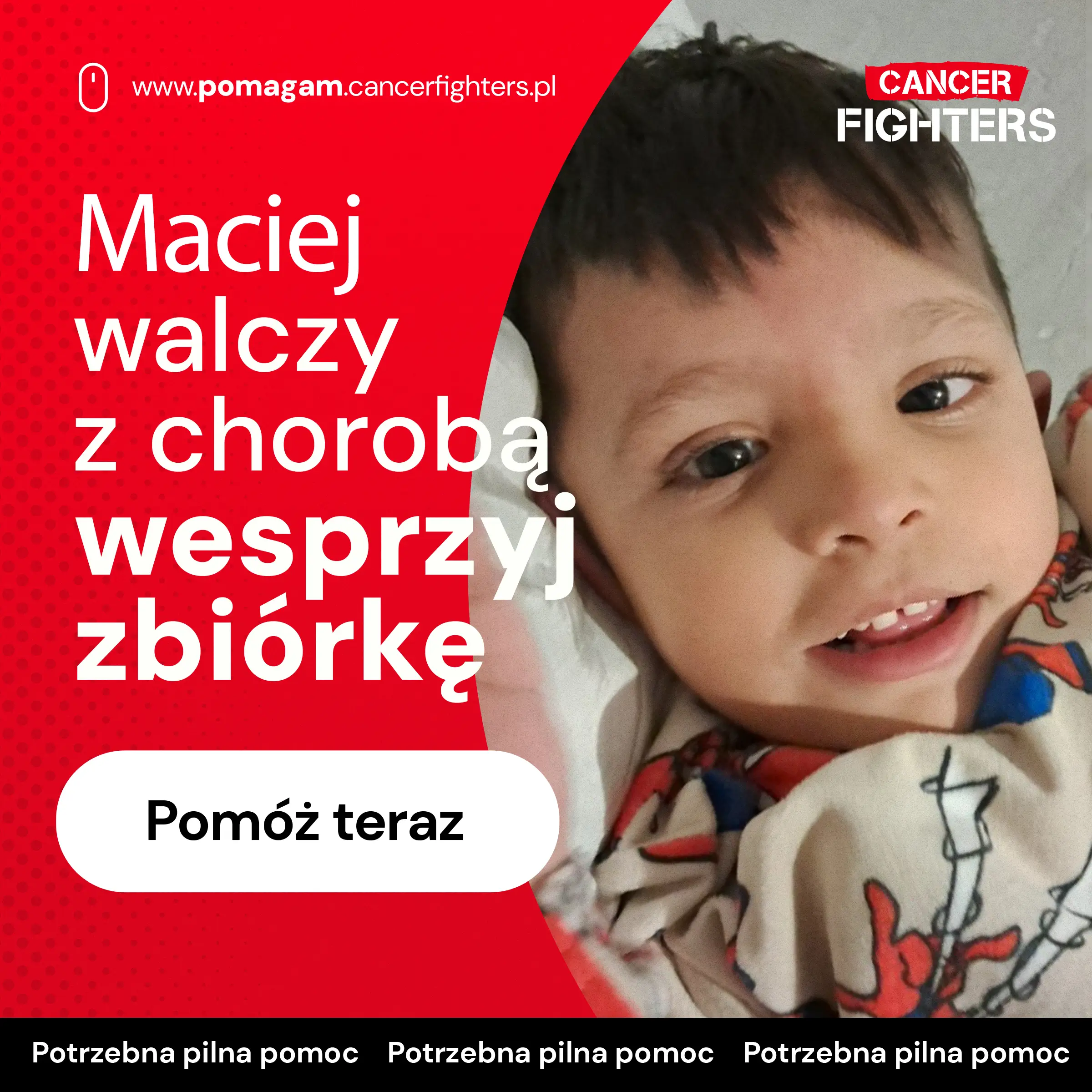 Dziś pięcioletni Maciuś żyje z dala od domu, mierząc się z trudami leczenia, tęsknotą i ogromnym obciążeniem emocjonalnym. Każdy dzień to walka o zdrowie i o odzyskanie dzieciństwa, które choroba brutalnie przerwała. Wsparcie dla niego i jego rodziny ma realne znaczenie — to pomoc, która daje siłę, odciąża w codziennych wyzwaniach i pozwala wierzyć, że przed Maćkiem wciąż czeka przyszłość pełna beztroski i radości.