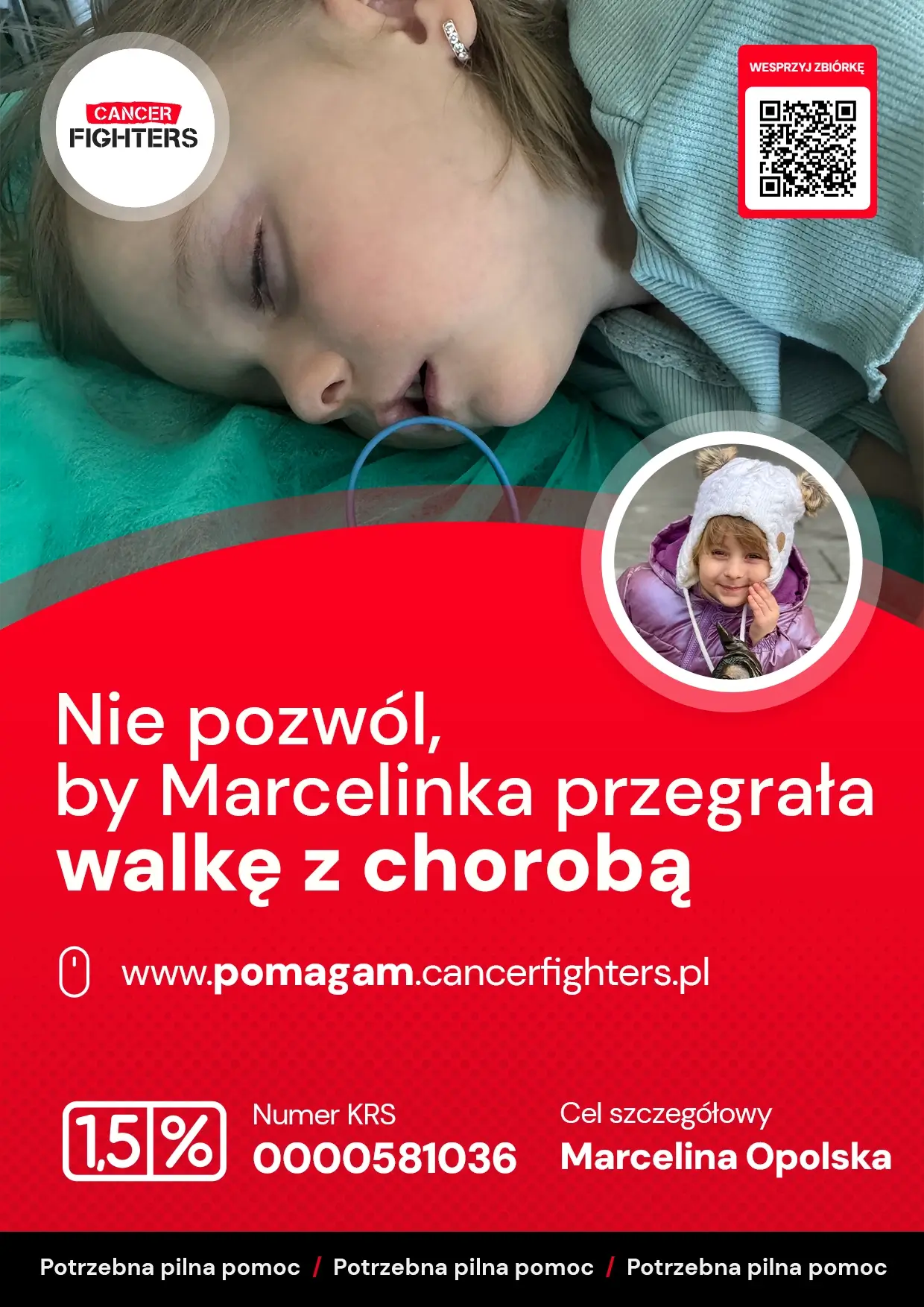 Marcelinka ma cztery lata i jest radosnym, pogodnym dzieckiem, które jeszcze nie zdaje sobie sprawy z tego, jak bardzo zmieniło się jej życie. Przez pierwsze lata rozwijała się wzorowo, szybko stała się samodzielna i bez problemu rozpoczęła przygodę z przedszkolem wśród starszych dzieci. Wszystko runęło 26 marca 2024 roku, gdy rutynowa morfologia wykazała dramatyczne zaburzenia krwi, a Marcelina trafiła pilnie do Przylądka Nadziei z podejrzeniem ostrej białaczki. Kolejne tygodnie i miesiące przyniosły lawinę badań, biopsji i konsultacji w Polsce oraz za granicą. Choć wykluczono nowotwory i inne choroby krwi, stan dziewczynki się pogarszał, a rodzina żyła w niepewności, nie znając przyczyny jej problemów zdrowotnych.