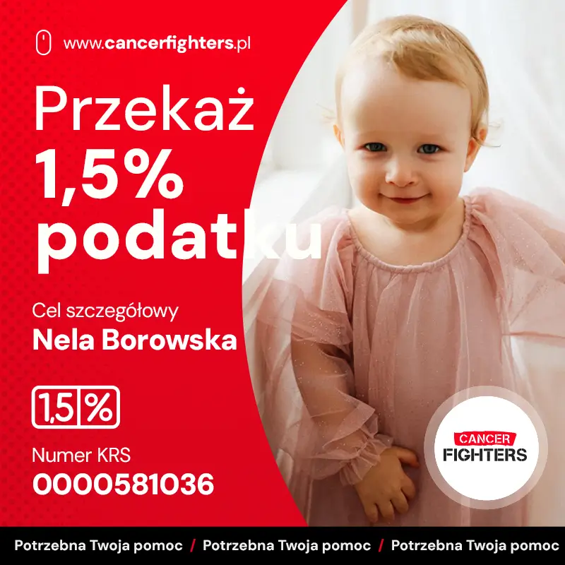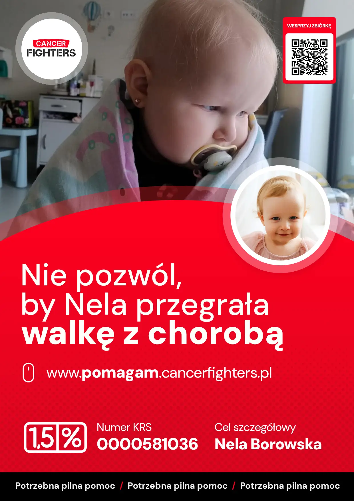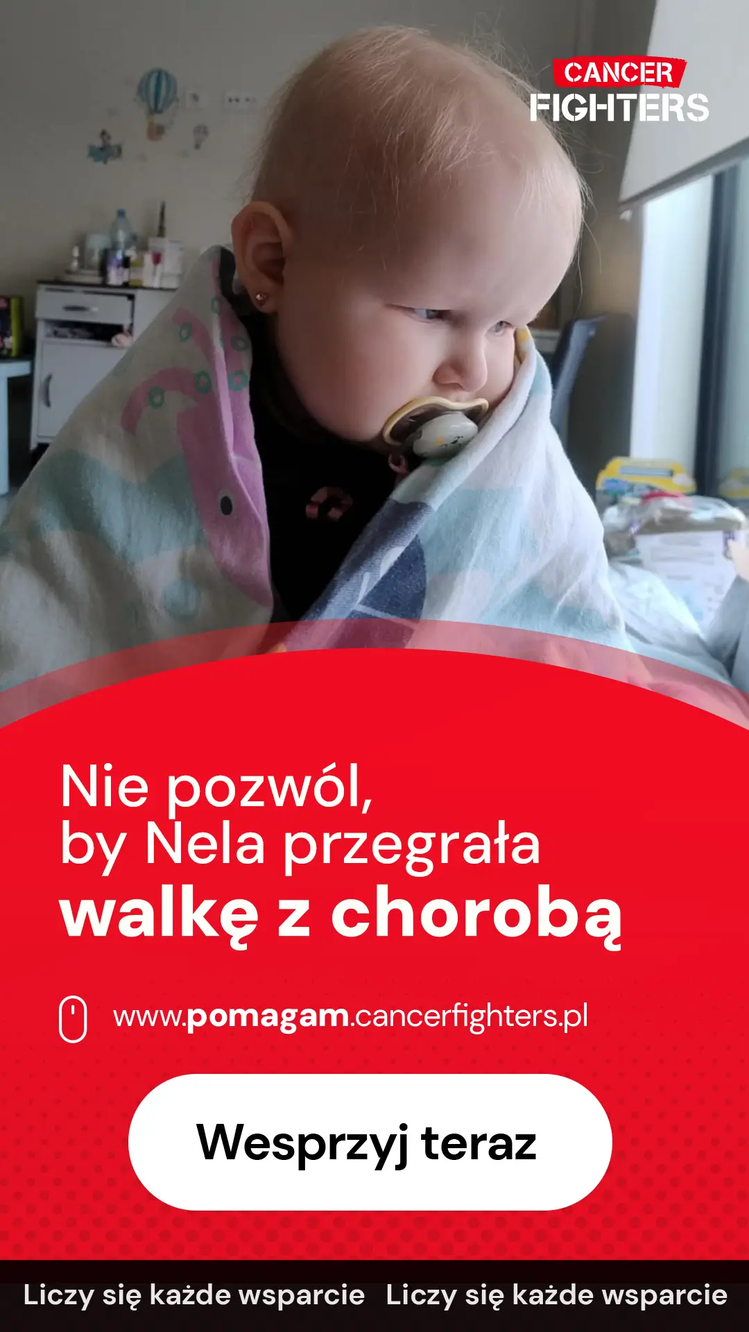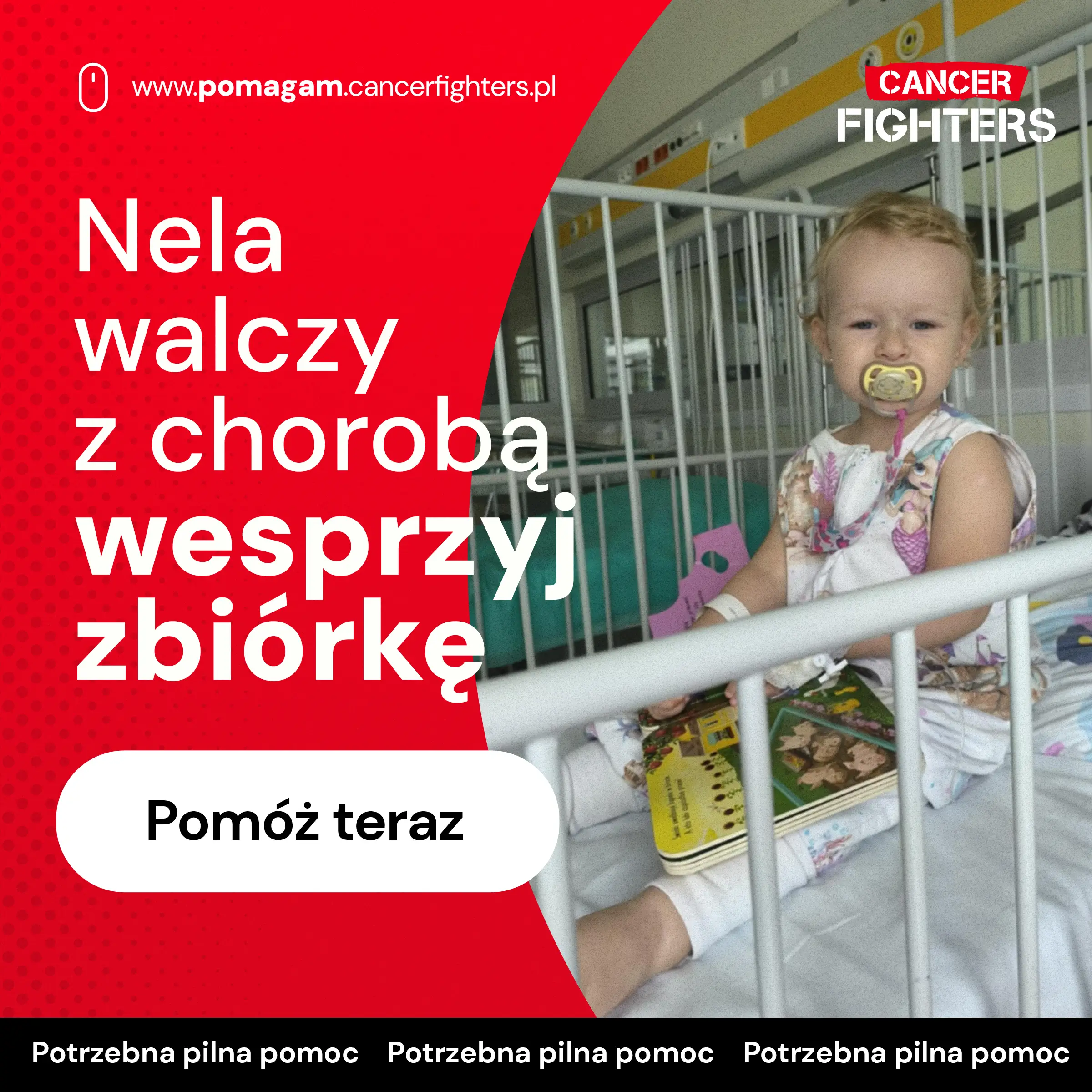 Niestety w 15. dobie terapii okazało się, że odpowiedź na leczenie jest niewystarczająca – Nela została zakwalifikowana do grupy wysokiego ryzyka nawrotu, co oznacza dłuższą i bardziej agresywną chemioterapię. Obecnie jest w trzecim bloku leczenia wysokiego ryzyka, przed nią jeszcze Protokół 2 i leczenie podtrzymujące, a chemioterapia wyraźnie odbiła się na jej sprawności – dziewczynka ma trudności z poruszaniem się i większość czasu spędza wtulona w tatę. Choroba uderzyła w rodzinę w najtrudniejszym możliwym momencie – gdy w domu była zaledwie dwumiesięczna siostrzyczka. Rodzice przenieśli całe życie do Warszawy: tata przebywa na urlopie bezpłatnym i czuwa przy Neli w szpitalu, mama z maleństwem mieszka w Domu Ronalda McDonalda, by być jak najbliżej i próbować utrzymać rodzinę razem. Koszty leczenia, pobytu, dojazdów i codziennego funkcjonowania rosną z każdym dniem, dlatego proszą o wsparcie – by Nela mogła wygrać tę walkę i mieć przyszłość.