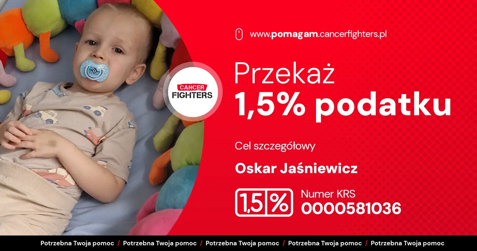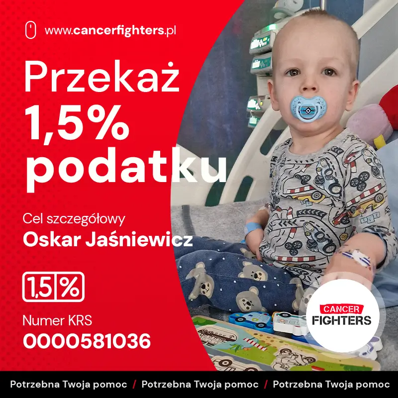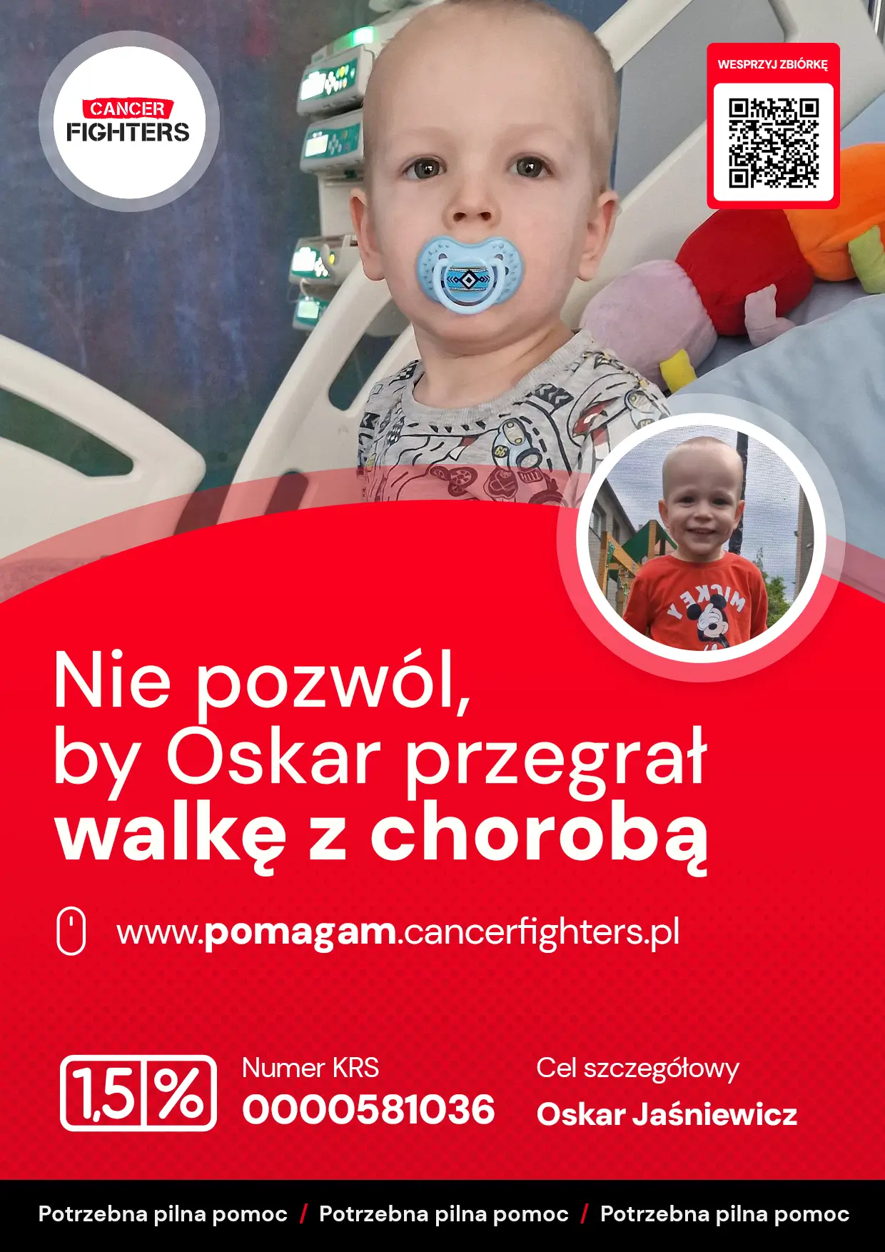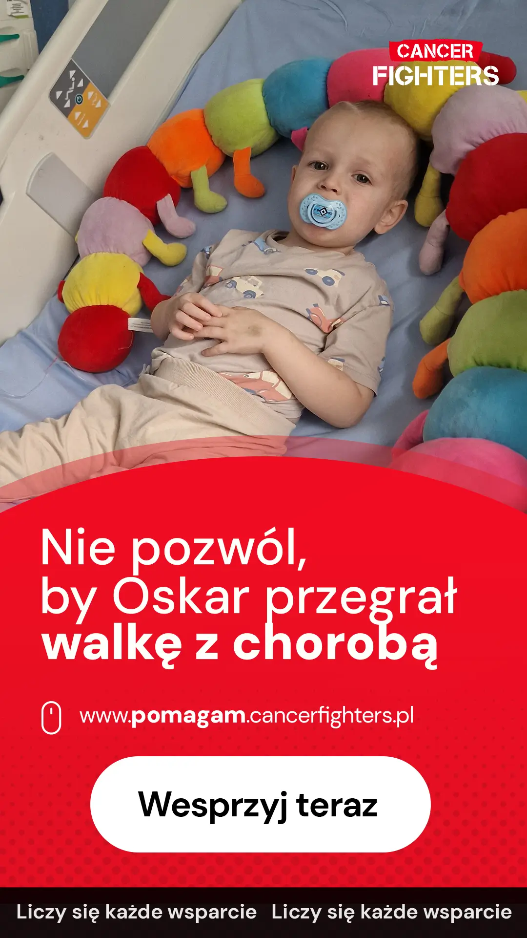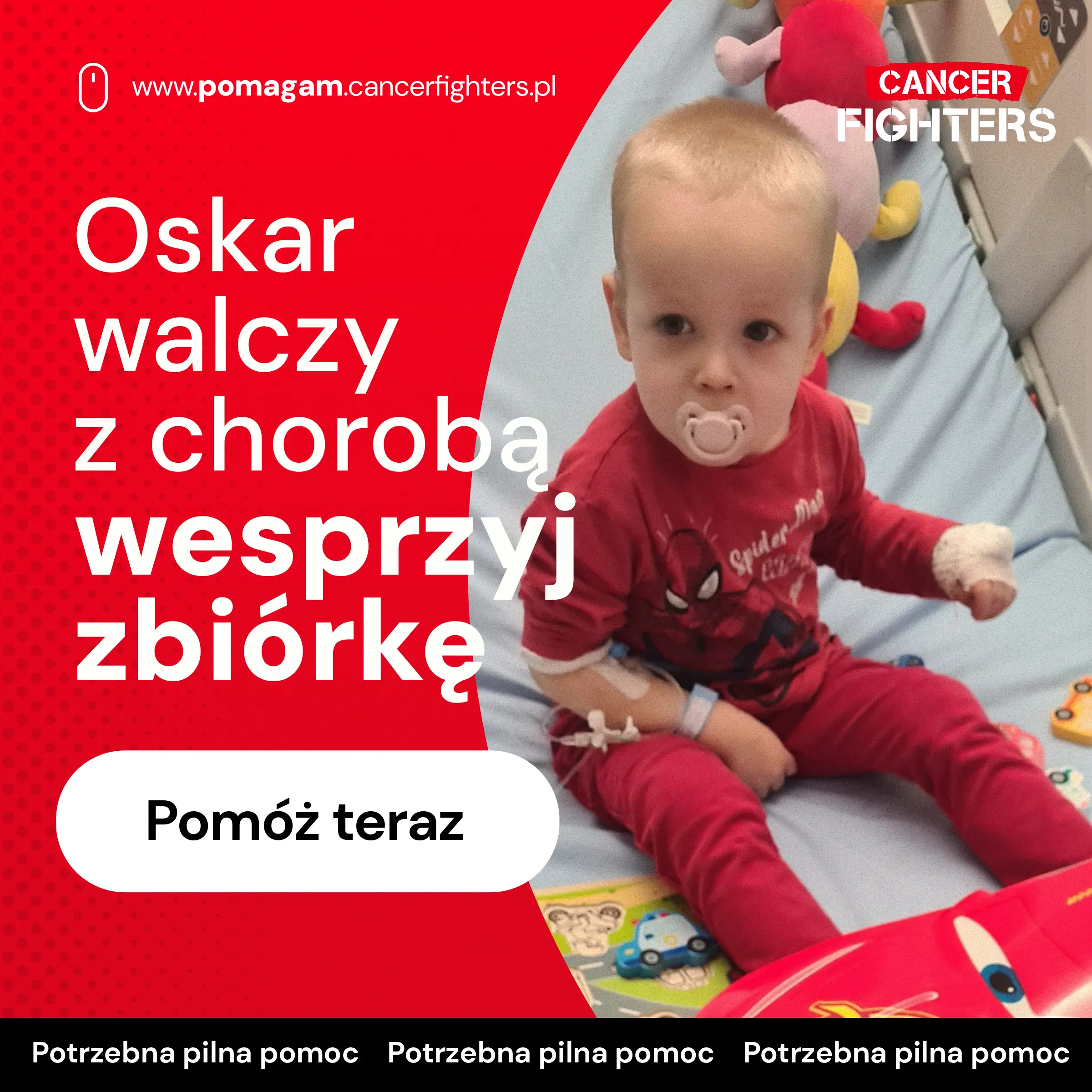 Od tego momentu wszystko potoczyło się błyskawicznie: punkcje, pobranie szpiku, pierwsze dawki chemioterapii i walka, która dopiero się zaczyna. Przy Oskarze nieustannie czuwa mama, która musiała zawiesić całe dotychczasowe życie, a tata łączy pracę z dojazdami do szpitala, zostawiając w domu roczną Lenkę. Rozdarcie rodziny stało się codziennością, podobnie jak strach i niepewność o jutro. Przed nimi długie miesiące leczenia, a ta zbiórka jest wołaniem o realną pomoc – o szansę, by trzyletni chłopiec mógł wygrać walkę z chorobą i odzyskać dzieciństwo, które zostało brutalnie przerwane.