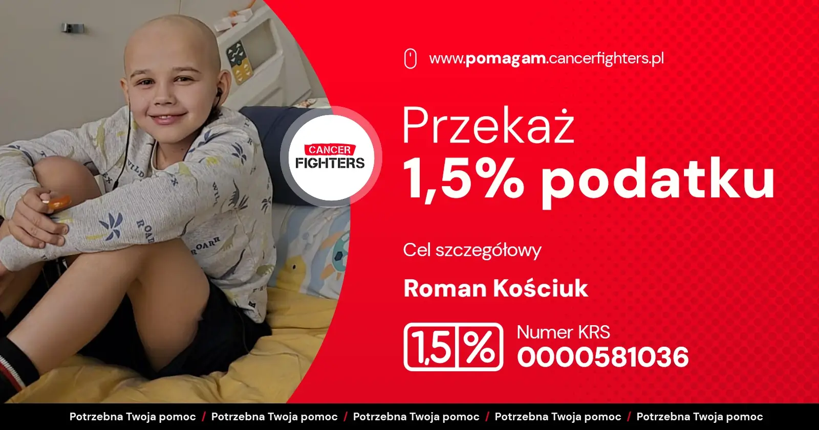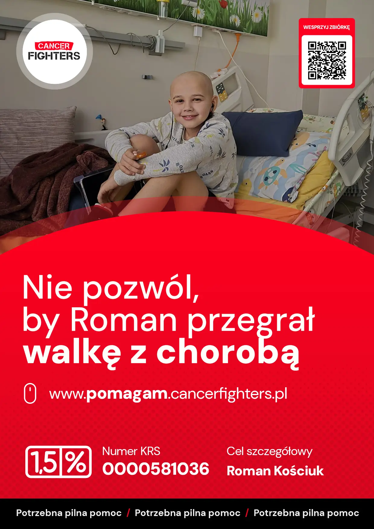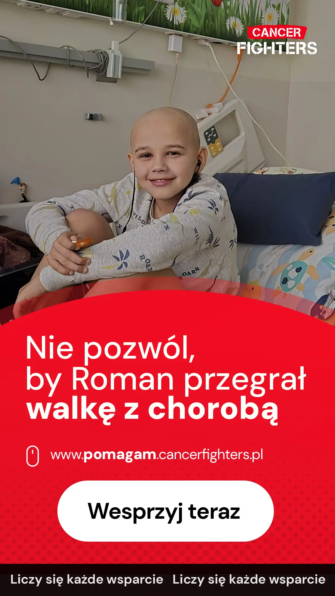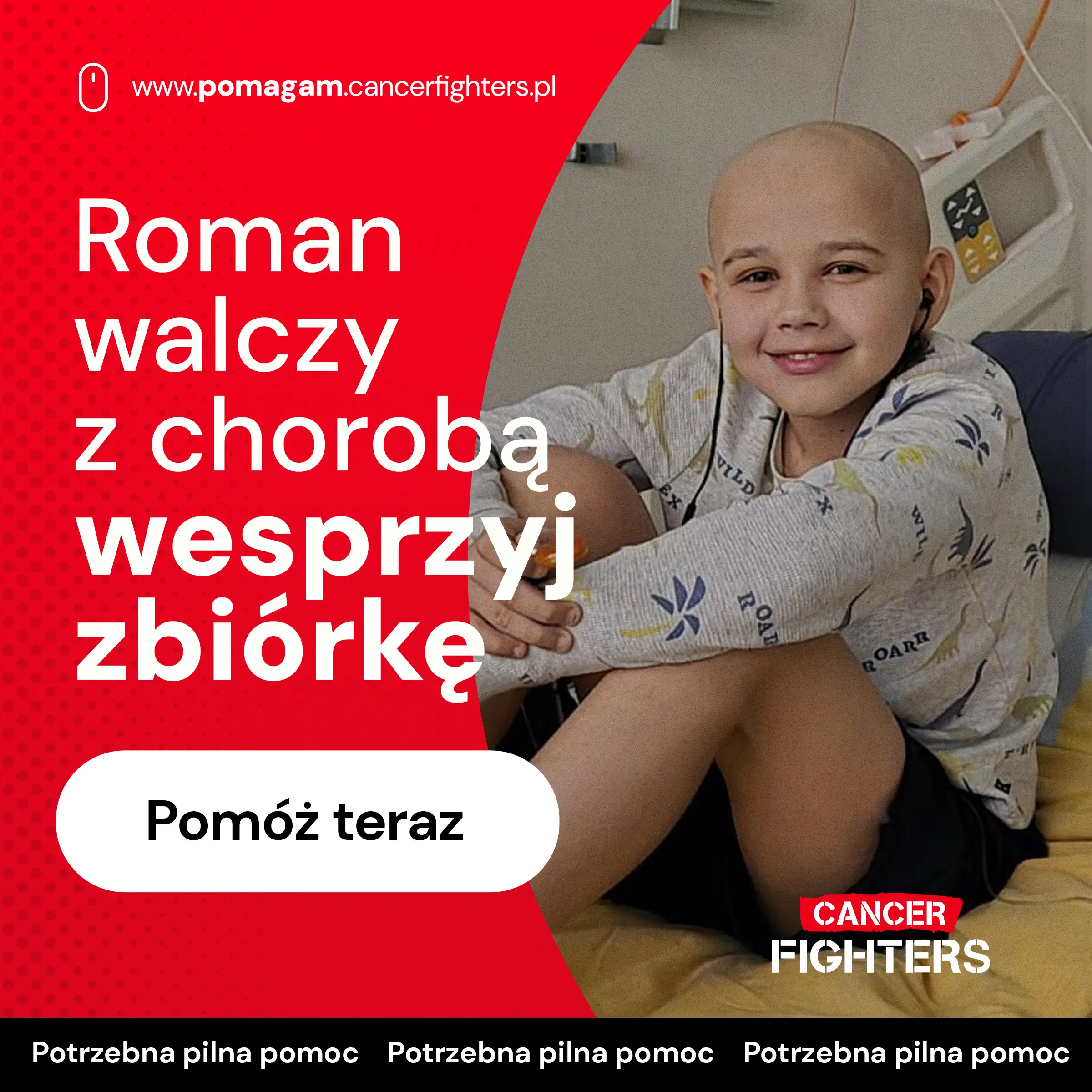 W listopadzie 2025 roku u jedenastoletniego Romka pojawił się silny ból, który początkowo budził go nocą, a z czasem stał się tak dotkliwy, że uniemożliwiał sen i normalne funkcjonowanie. Po dwóch bezsennych nocach rodzice zdecydowali się na pilny wyjazd na Szpitalny Oddział Ratunkowy. Przeprowadzona diagnostyka i biopsja ujawniły przyczynę cierpienia — osteosarcomę prawej kości udowej. Diagnoza całkowicie zmieniła życie rodziny, a leczenie rozpoczęto natychmiast. Romek jest obecnie po sześciu cyklach chemioterapii, które powodują liczne powikłania, takie jak wymioty, skrajne osłabienie, problemy z układem pokarmowym oraz niebezpieczne spadki parametrów krwi wymagające transfuzji. Kolejnym etapem będzie operacja.