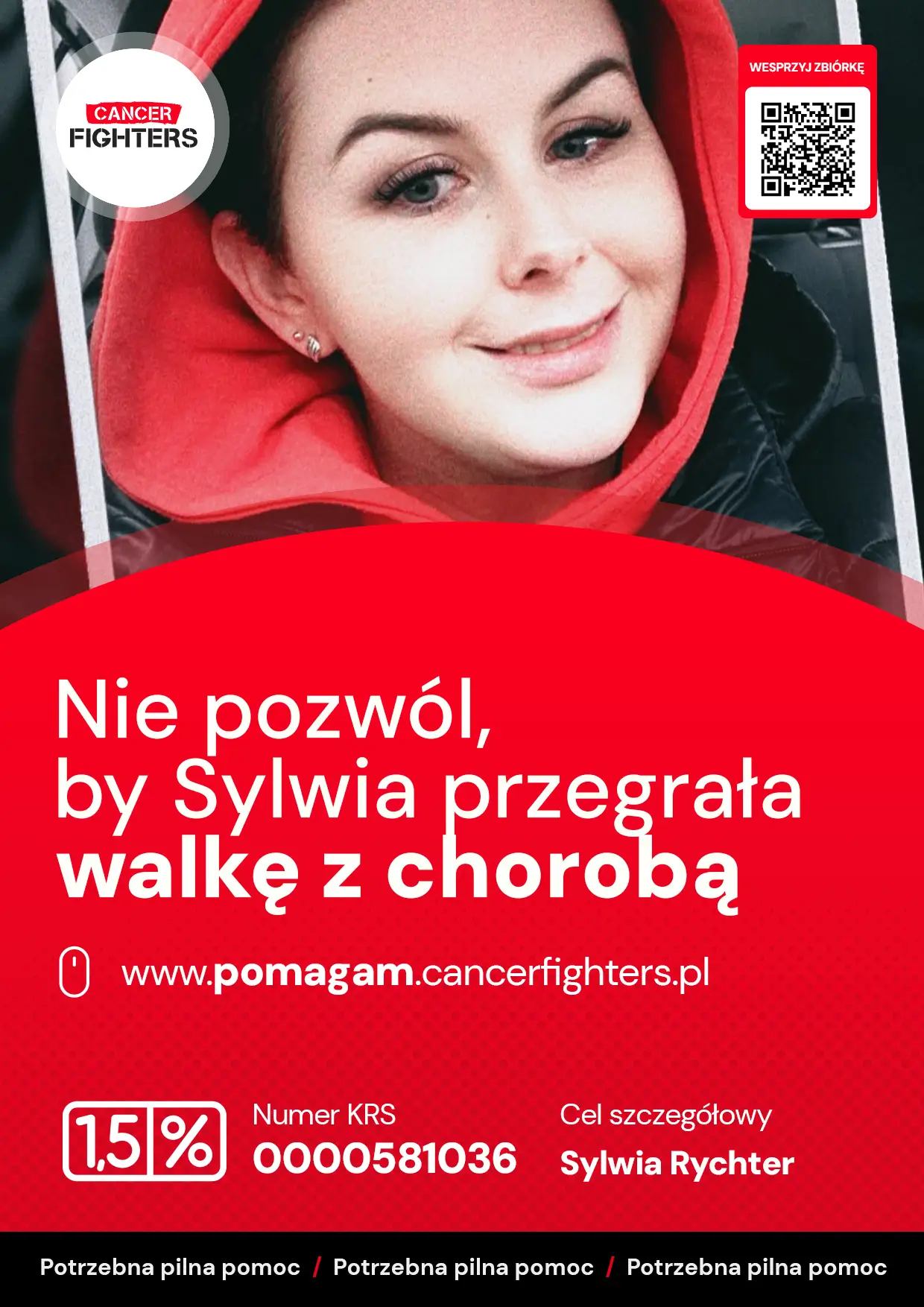 W październiku 2020 roku Sylwia wyczuła pod pachą niewielkie zgrubienie, które początkowo nie wydawało się groźne. Biopsja wykonana w grudniu przyniosła jednak diagnozę: mięsak typu synovial sarcoma. Badania obrazowe wykazały rozległą zmianę w obrębie klatki piersiowej, obejmującą tkanki miękkie i żebro, dlatego leczenie rozpoczęto natychmiast. W 2021 roku Sylwia przeszła sześć kursów chemioterapii, a następnie rozległą operację usunięcia guza wraz z fragmentem płuca i żeber. Pojawiła się nadzieja, że choroba została pokonana, jednak w 2024 roku kontrolne badania ujawniły nawrót w trzustce. Rozpoczęto kolejną chemioterapię, lecz podczas próby operacji okazało się, że guz jest nieoperacyjny i konieczne było wykonanie zespolenia omijającego. Latem 2025 roku wyniki przyniosły poprawę, jednak najnowsza tomografia ponownie wykazała naciek w obrębie głowy trzustki oraz zmianę w wątrobie. Sylwia oczekuje obecnie na decyzje dotyczące dalszego leczenia.