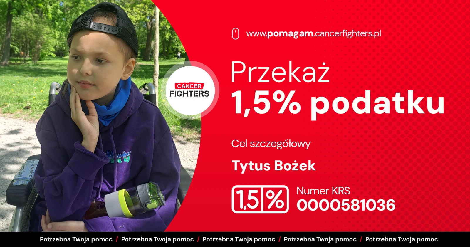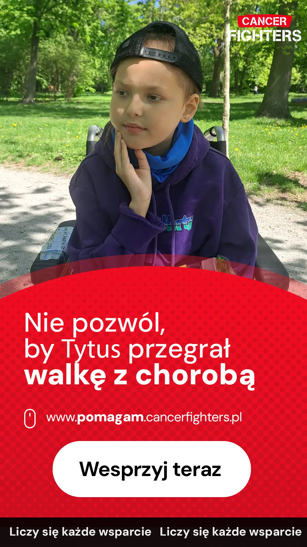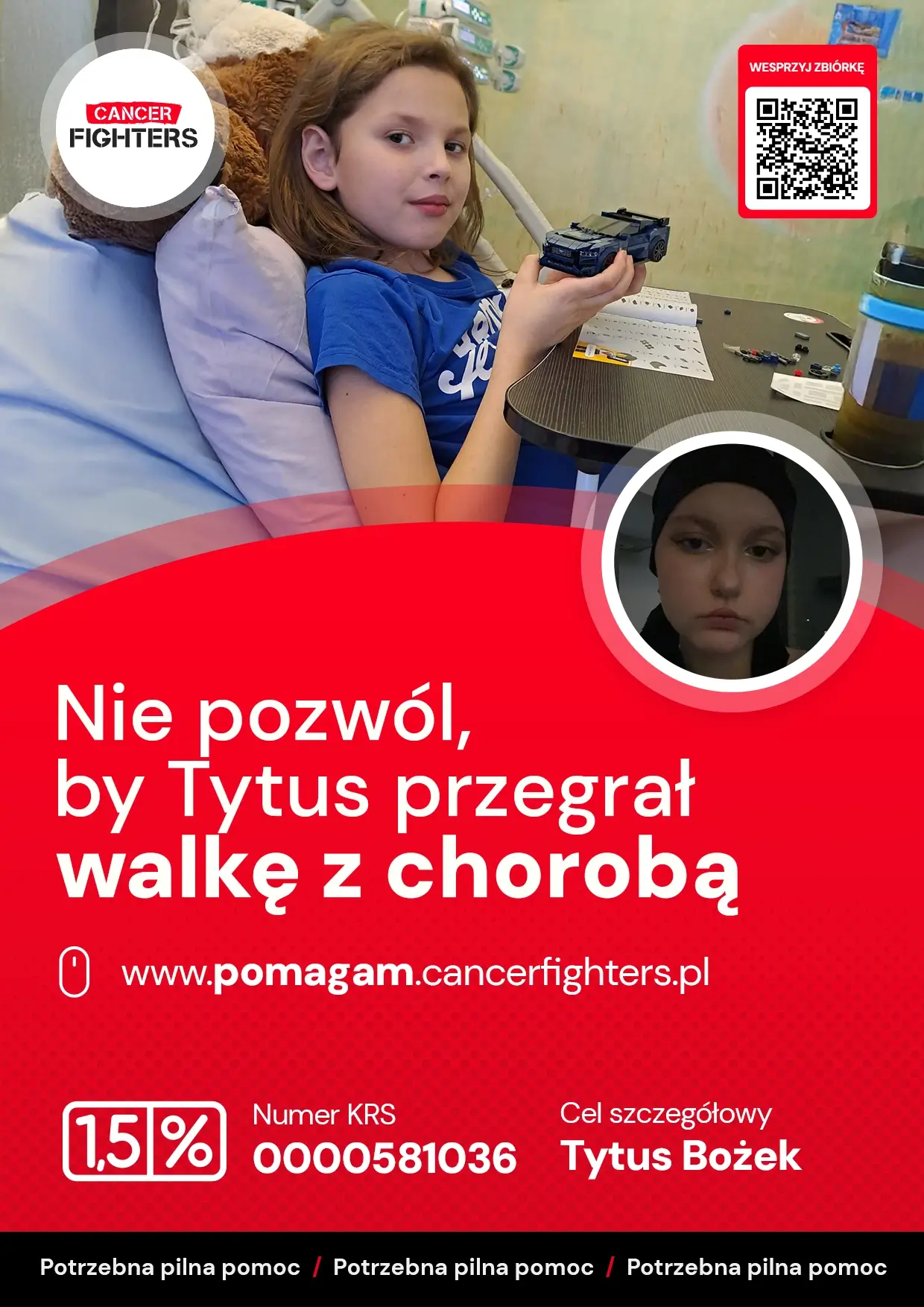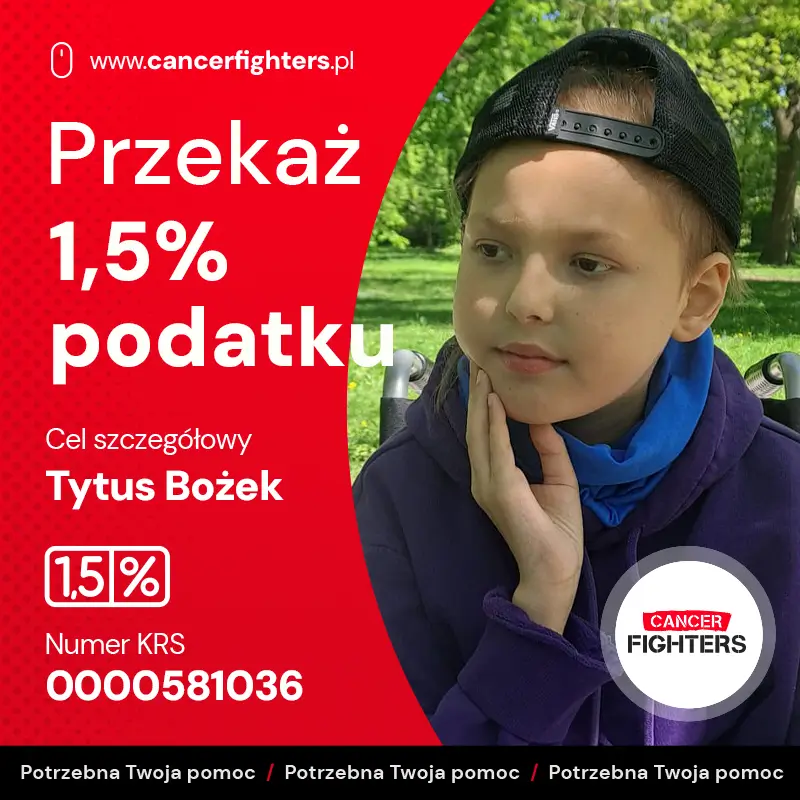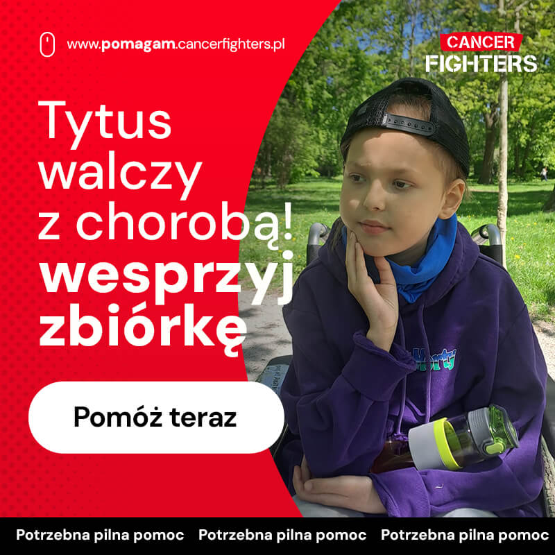 Mimo choroby Tytus pozostaje pogodnym, dzielnym chłopcem. Uwielbia budować z klocków i grać w szachy, choć dziś tęskni za domem, młodszym bratem, ukochanymi psami i spokojem, którego tak bardzo brakuje w szpitalnej rzeczywistości. Leczenie jest długie i kosztowne – dochodzą dojazdy, leki, specjalna dieta, rehabilitacja i stała opieka medyczna, które każdego dnia obciążają rodzinę coraz bardziej. Tytus ma dopiero 10 lat i całe dzieciństwo przed sobą, ale by mógł do niego wrócić, potrzebuje wsparcia. Każda pomoc to realny krok w stronę zdrowia i szansy na normalne, radosne życie.