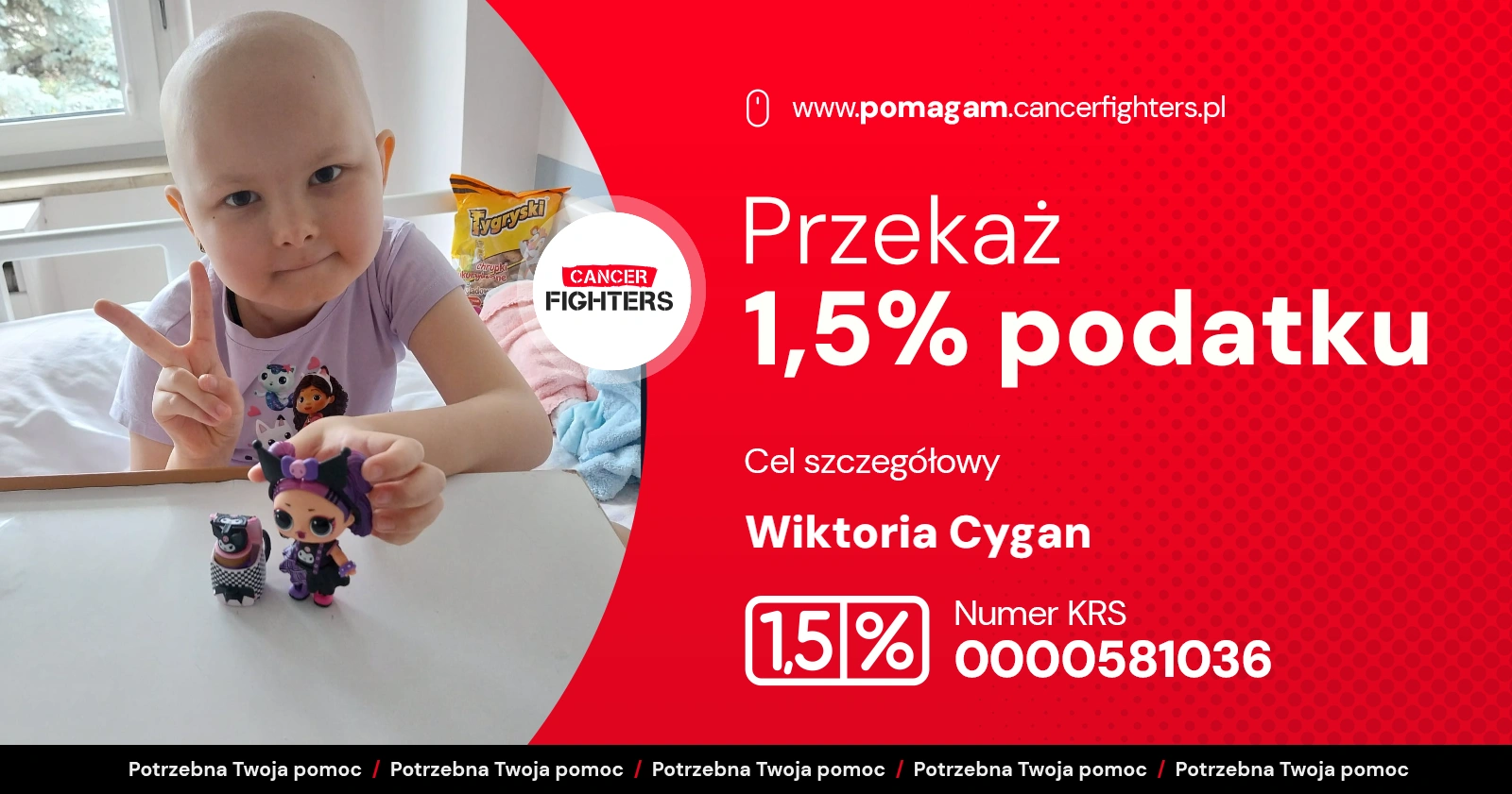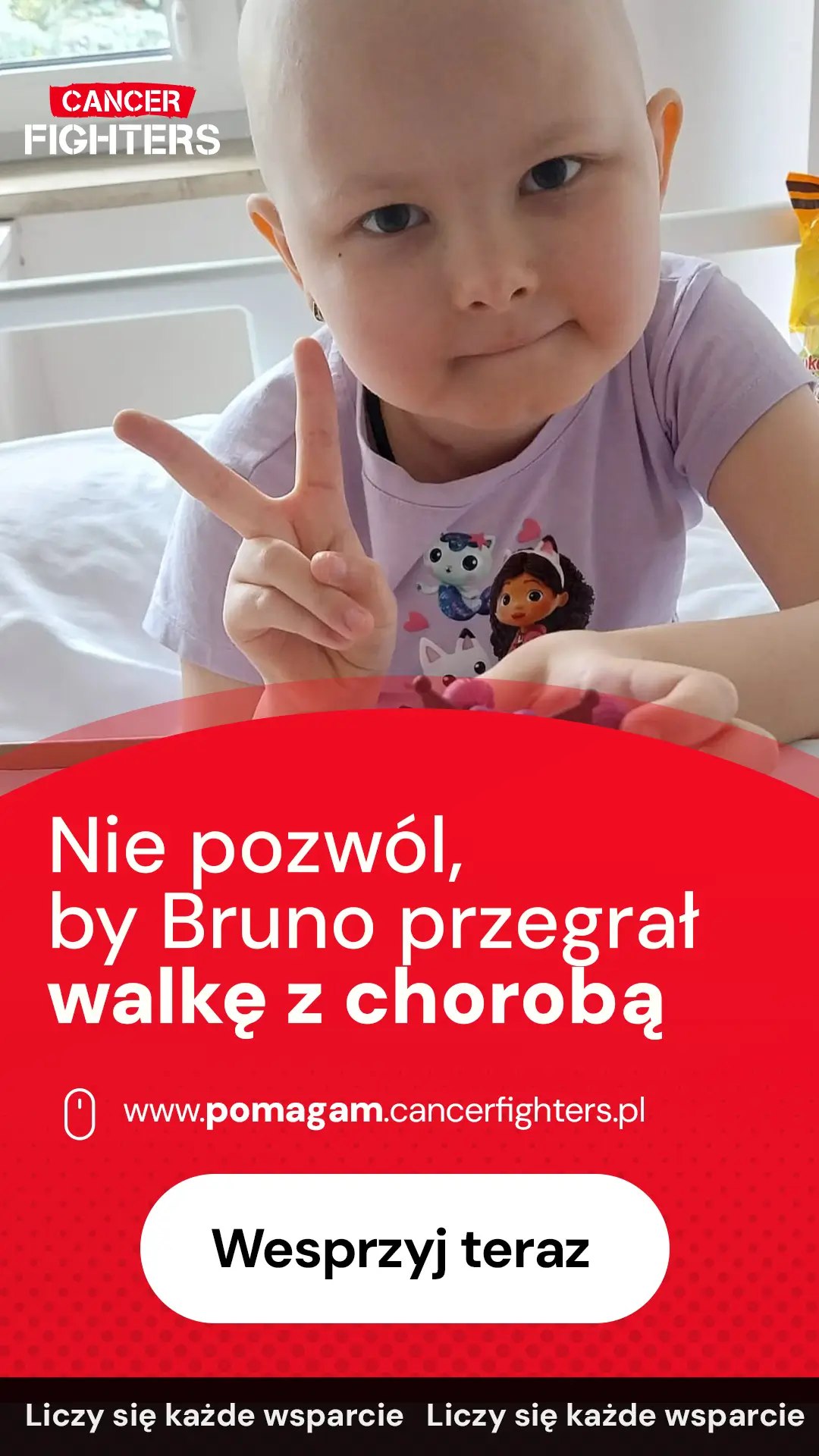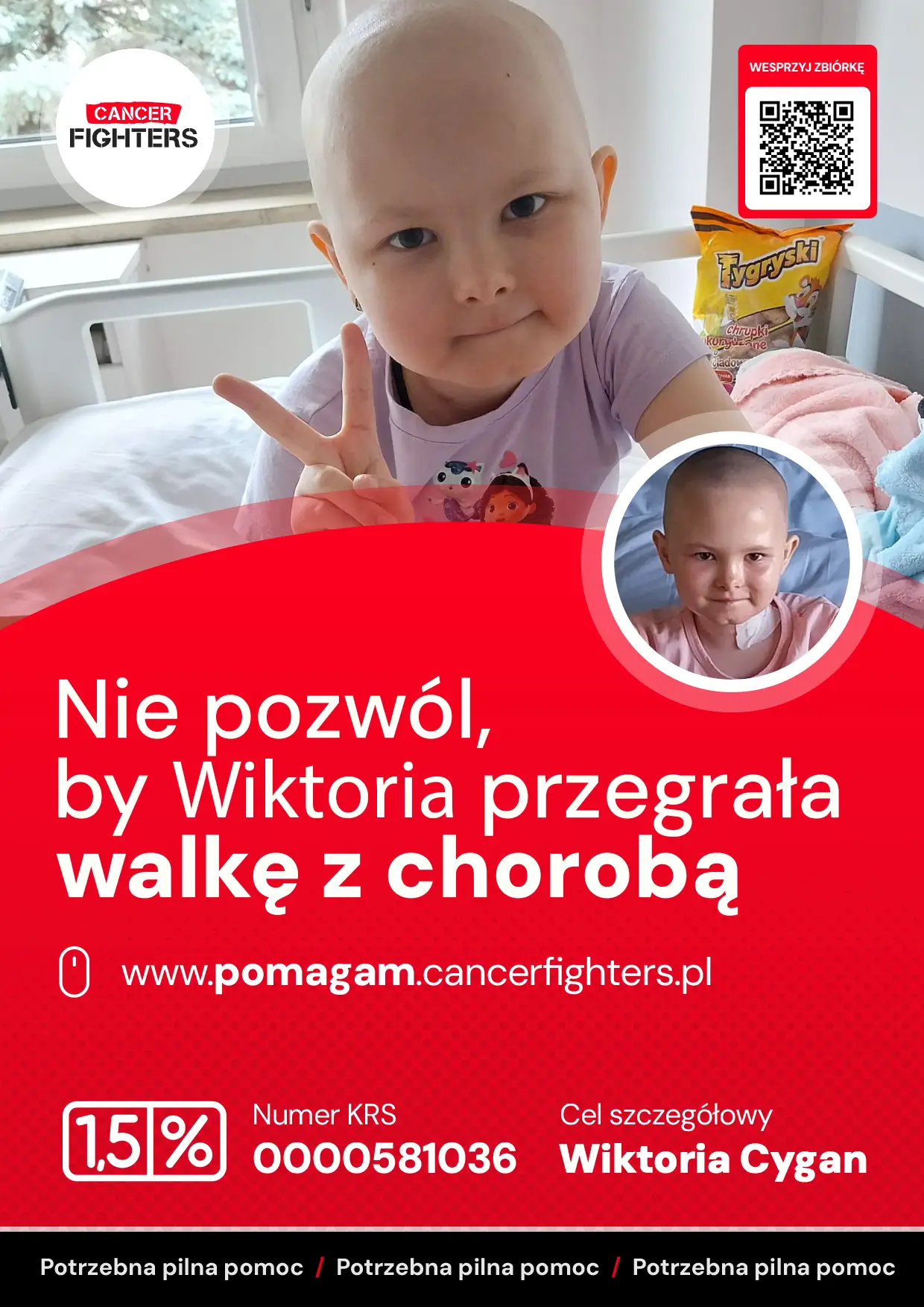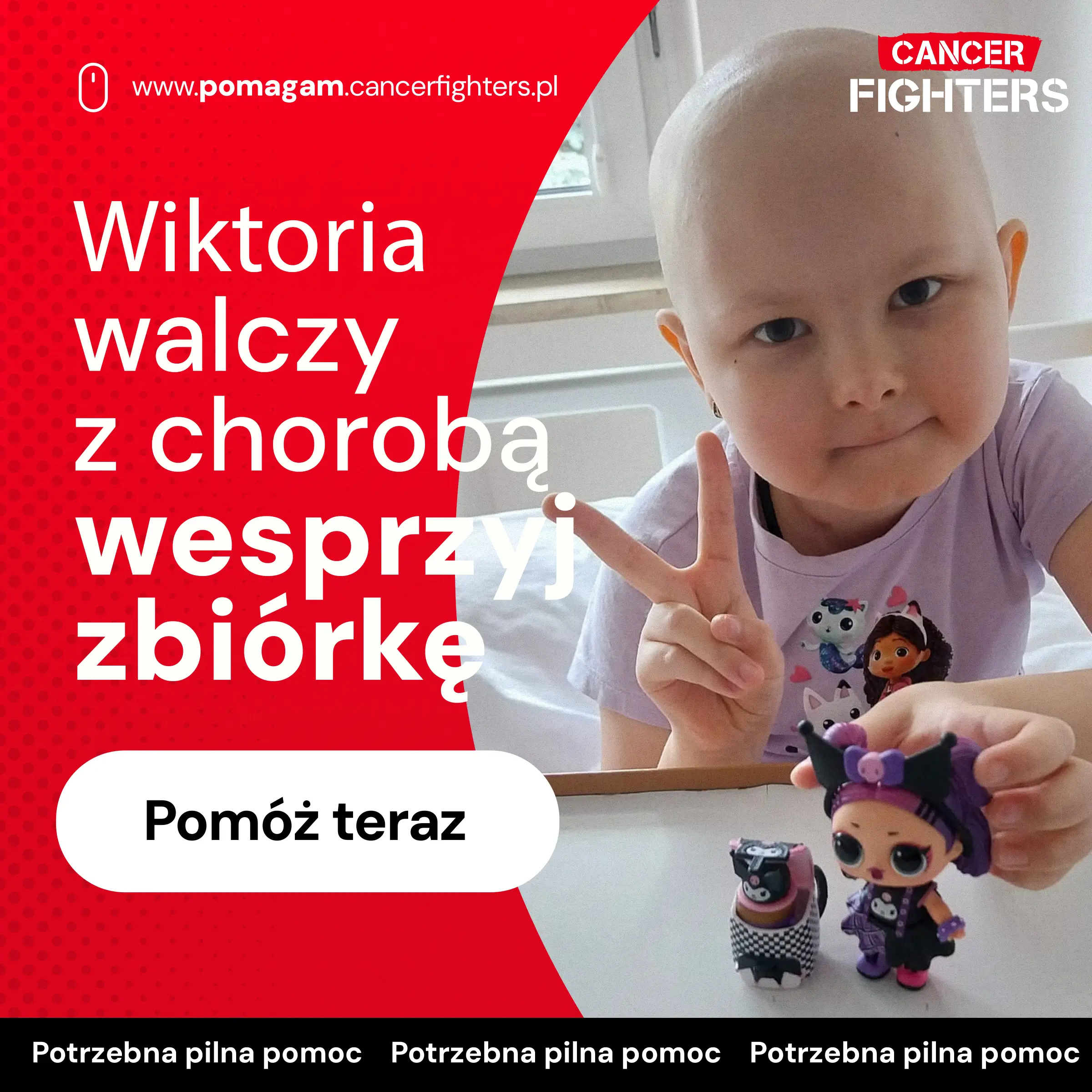 Pod koniec 2024 roku choroba wróciła – silniejsza i bezwzględna. Postępujące problemy z poruszaniem się zakończyły się całkowitą utratą zdolności chodzenia, a badania potwierdziły wznowę białaczki z naciekami na kręgosłup. Agresywne leczenie nie przyniosło efektów, a jedyną szansą na życie okazał się przeszczep szpiku. Po miesiącach oczekiwań udało się znaleźć dawcę i przeprowadzić transplantację. Dziś Wiktoria jest w trakcie trudnej rekonwalescencji – osłabiona, wymagająca intensywnej rehabilitacji i stałej opieki. Każdego dnia towarzyszy jej tata, który samotnie dźwiga ciężar leczenia, opieki i kosztów. To historia ogromnej miłości, wytrwałości i nadziei, która – mimo wszystko – wciąż trwa.