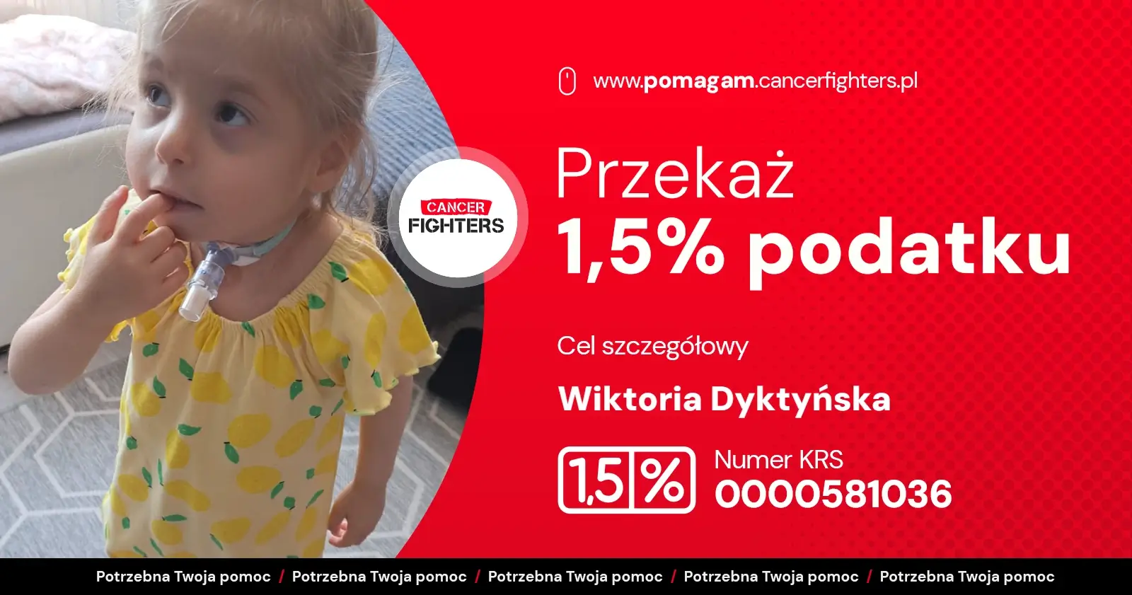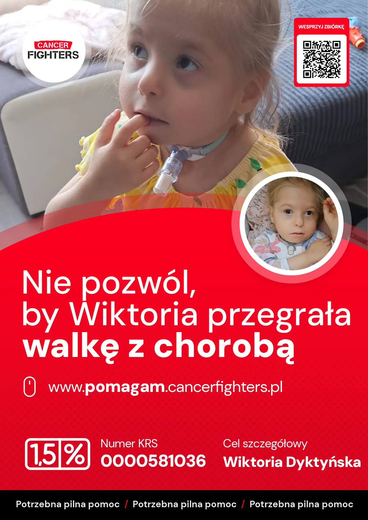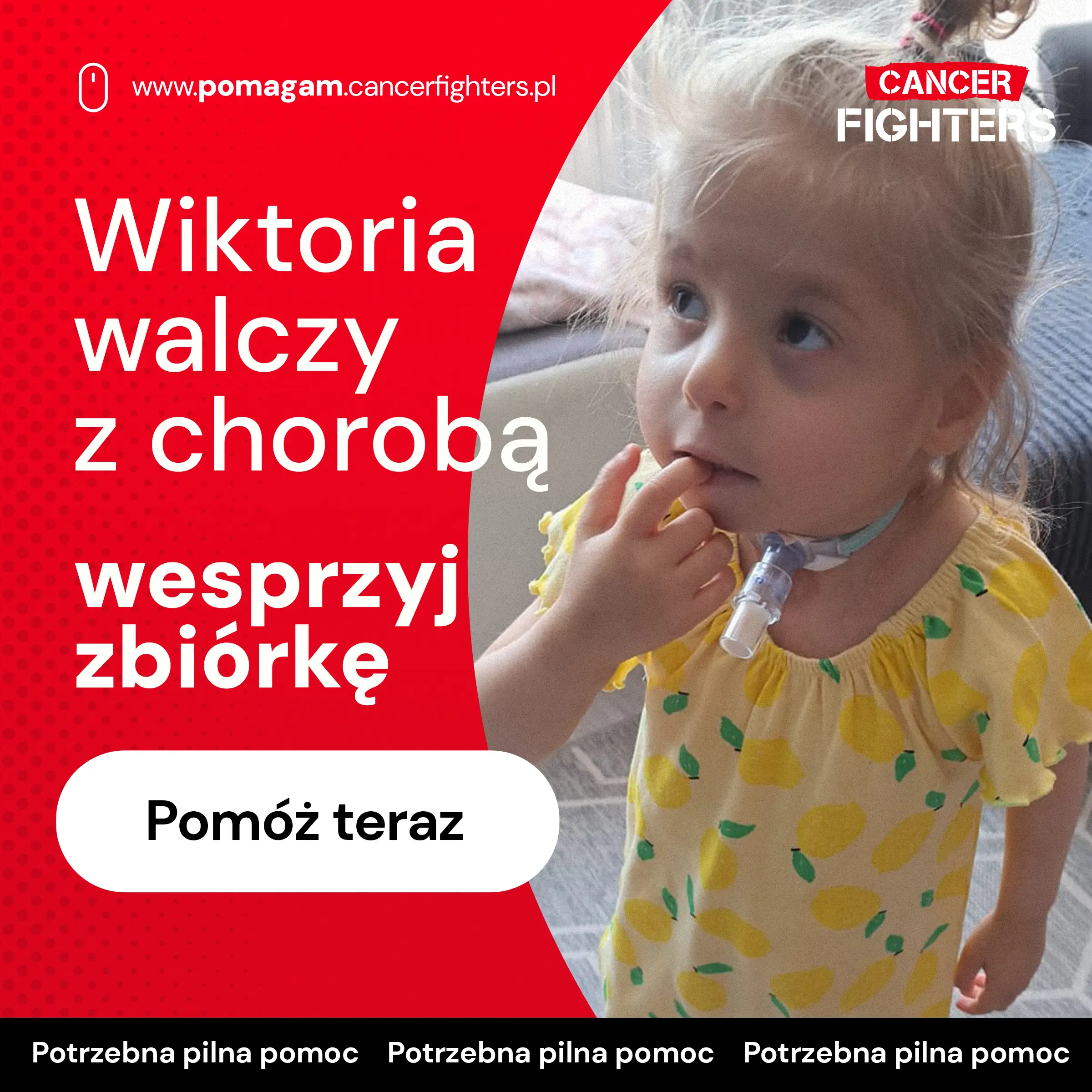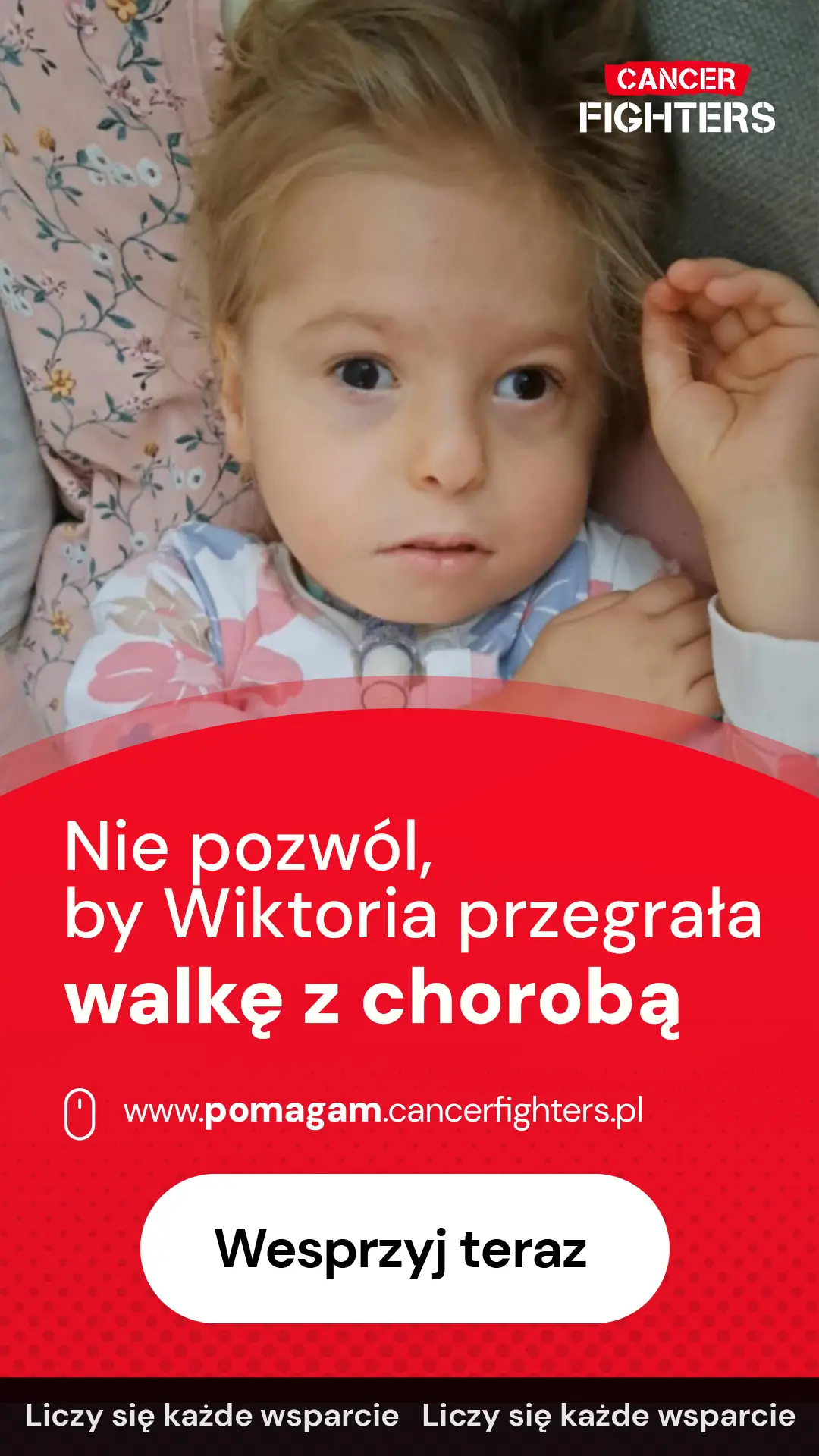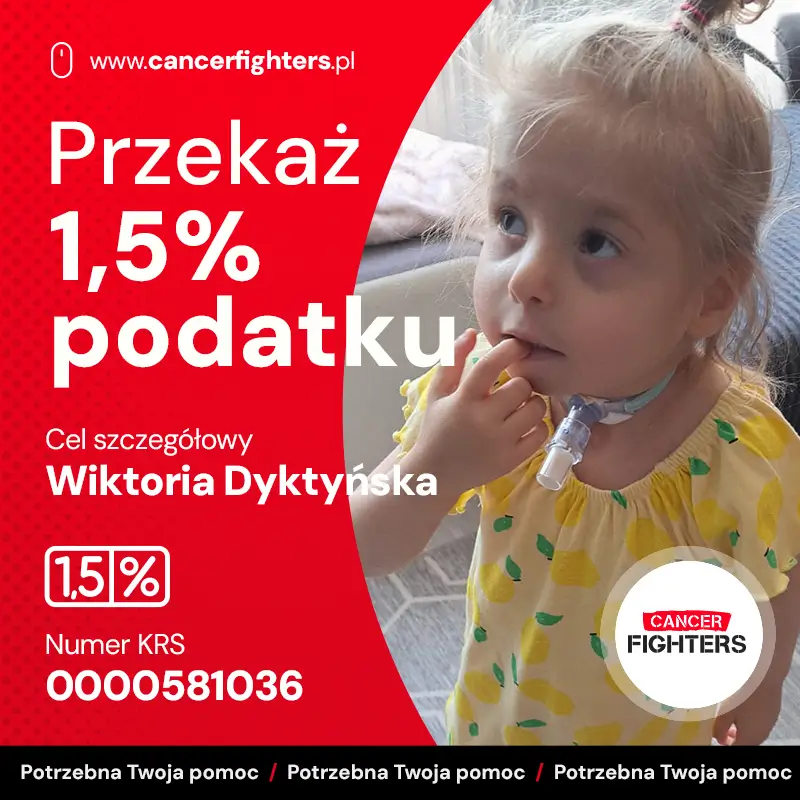 Życie rodziny to nieustanna gotowość między domem a szpitalem. Mama całkowicie poświęciła się opiece, tata pracuje, by utrzymać dom, a dziesięcioletni brat Kacper stara się wspierać siostrę na miarę swoich możliwości. Każdy dzień to czuwanie przy rurce tracheostomijnej, karmienie przez PEG, wizyty u specjalistów i rehabilitacja, a także emocjonalny i fizyczny ciężar związany z ciągłym lękiem o zdrowie dziewczynki. Zebrane środki pomogą pokryć koszty leczenia, transportu, rehabilitacji i specjalistycznego żywienia — dając Wiktorii i jej rodzinie szansę na bezpieczniejszą przyszłość i przygotowanie do przeszczepu. W świecie, który powinien być wypełniony beztroską, jej dzieciństwo zostało zamknięte w granicach walki o życie.