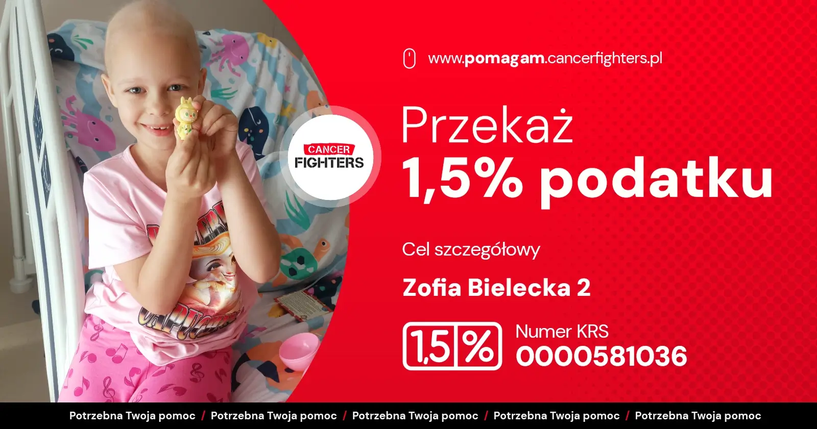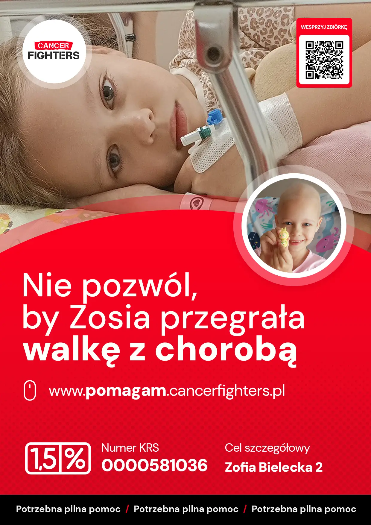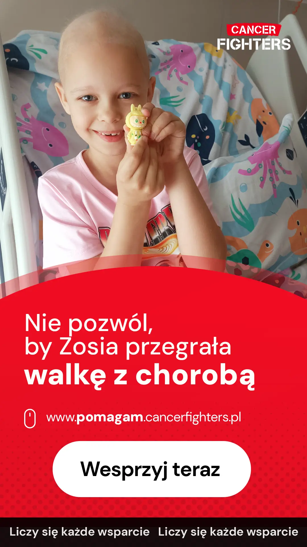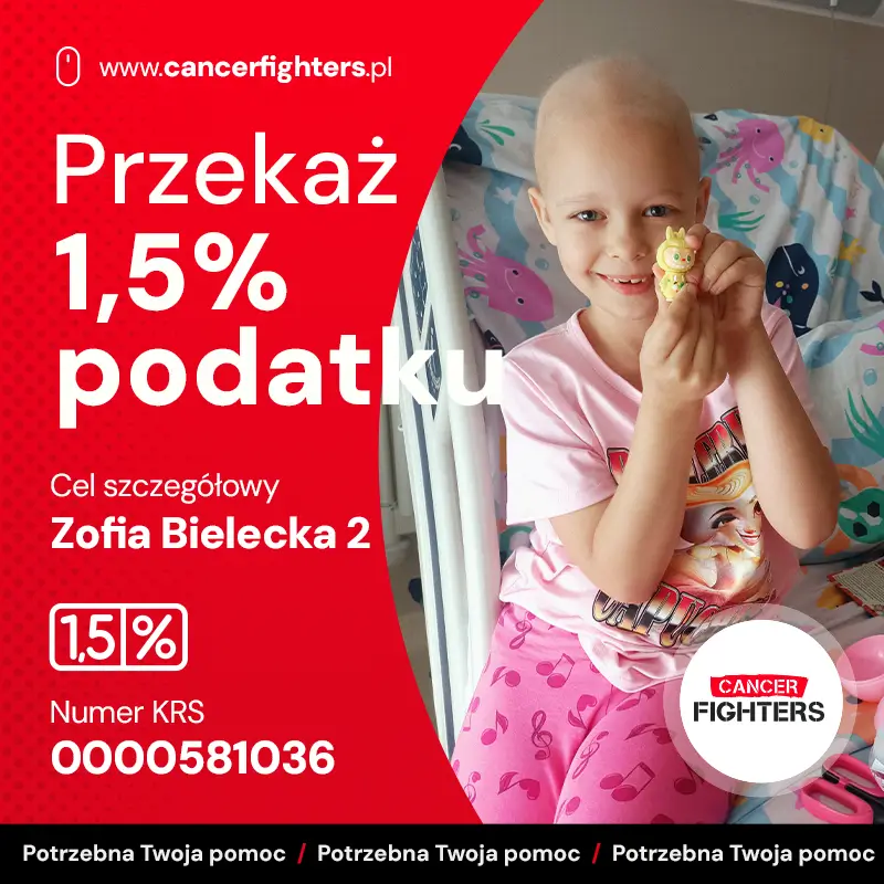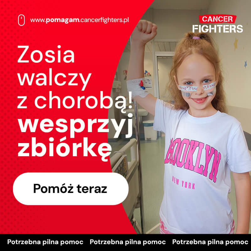 Przed Zosią kolejne miesiące walki: sześć tygodni radioterapii, następne cykle chemii podtrzymującej oraz specjalistyczne konsultacje, w tym wysyłka próbek guza do Niemiec w poszukiwaniu najlepszych metod leczenia. Choroba rozdzieliła rodzinę – mama mieszka z Zosią przy szpitalu w Warszawie, tata został 300 kilometrów dalej, w domu, z pięcioletnią Zuzią. Codzienność wypełniają tęsknota, rozmowy przez telefon i krótkie wizyty, a młodsza siostra próbuje zrozumieć, dlaczego jej ukochana Zosia musi zostać w szpitalu, bo w jej głowie zamieszkał „potworek”, którego lekarze próbują przepędzić. Choć piękne włosy Zosi są już tylko wspomnieniem, jej uśmiech wciąż daje siłę całej rodzinie – to uśmiech dziecka, które chce wrócić do zabawy, słońca i zwyczajnego dzieciństwa.