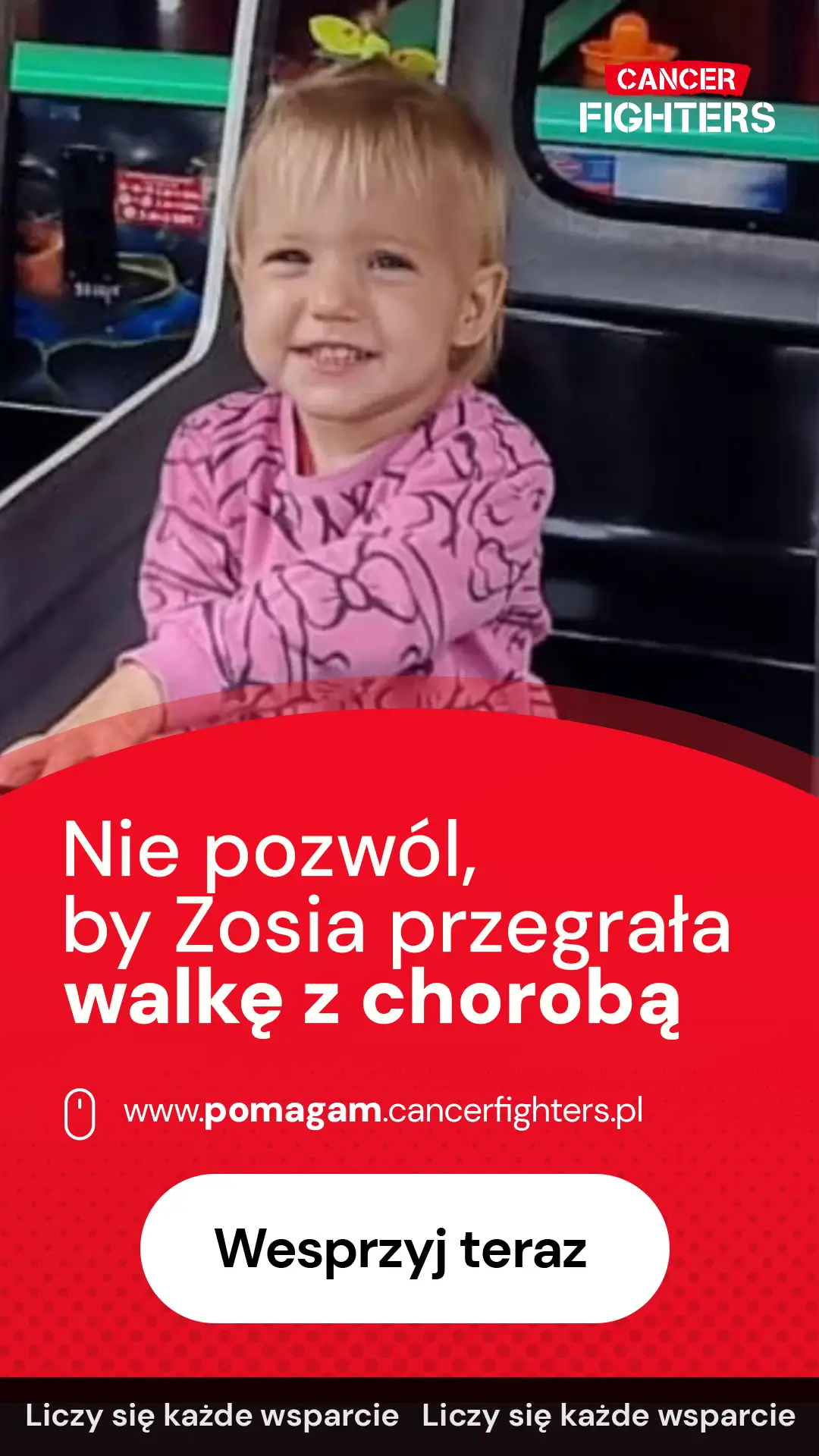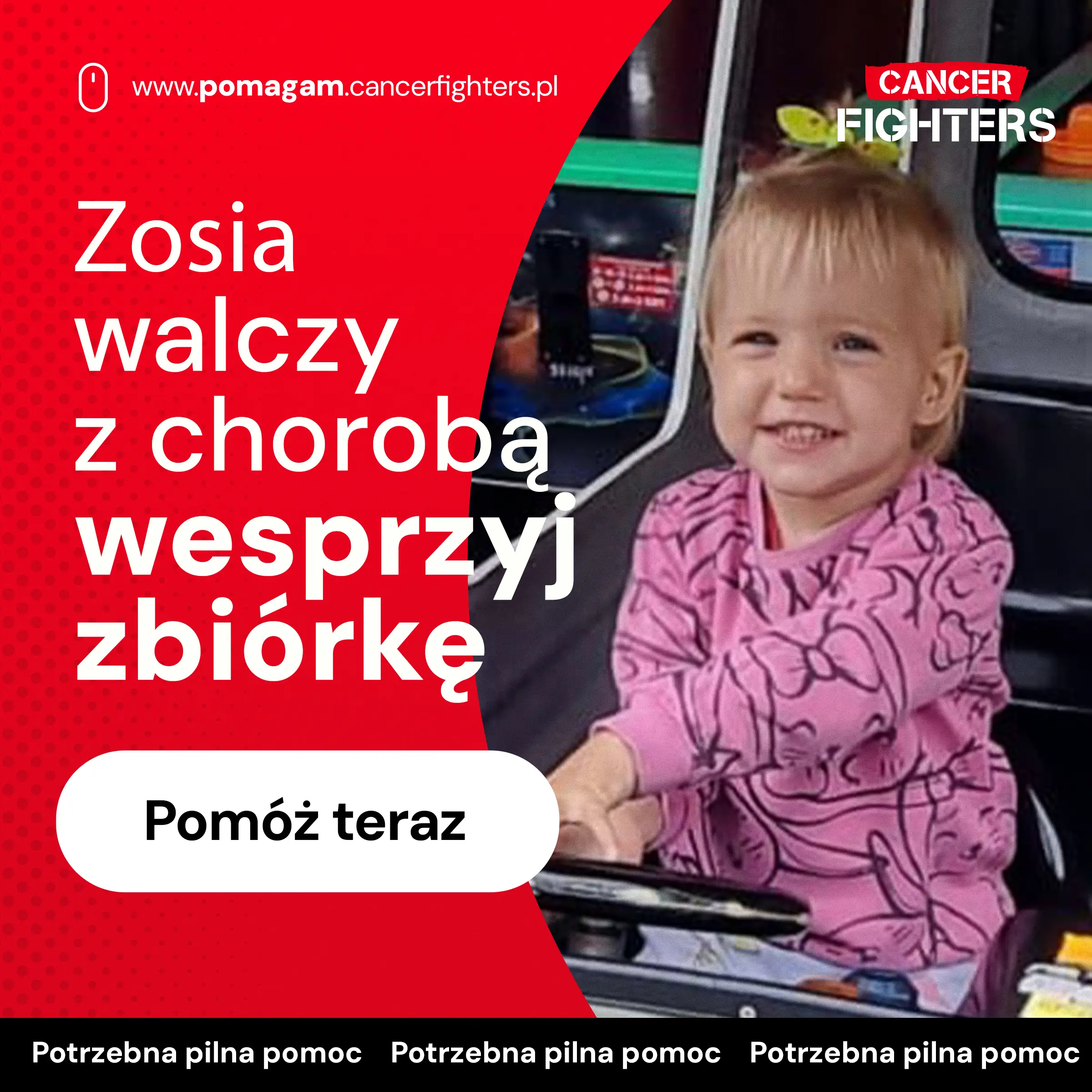 Zosia od urodzenia zmagała się z wieloma wyzwaniami zdrowotnymi — opóźnieniem psychoruchowym, wrodzonymi wadami serca oraz niedoborami odporności, które prowadziły do częstych, wyniszczających infekcji. Mimo trudnego startu była pogodnym, pełnym czułości dzieckiem, które uwielbiało lalki, piaskownicę i pierwsze próby jazdy na rowerze. Codzienność między rehabilitacją a kolejnymi wizytami lekarskimi przeplatała się z dziecięcą beztroską, a rodzice wierzyli, że jej życie stopniowo zaczyna zmierzać ku stabilności.