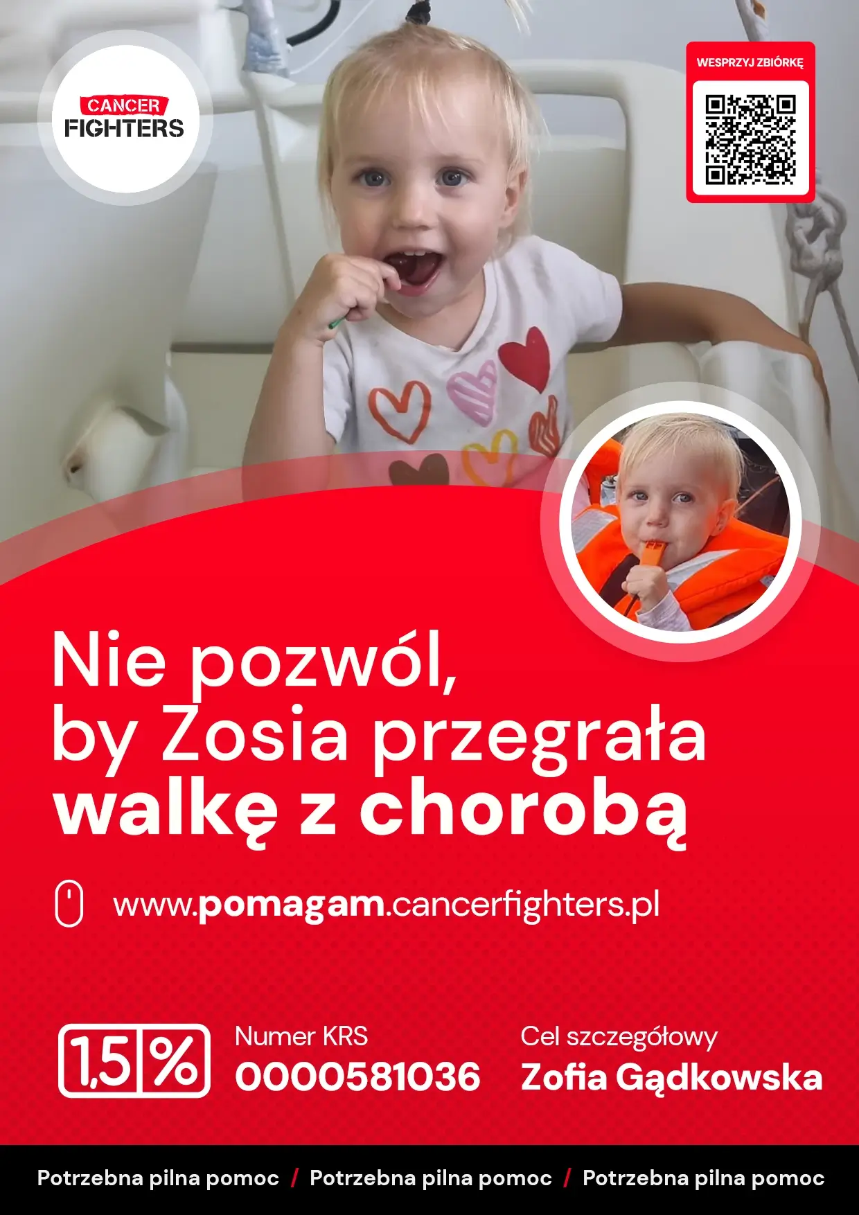 Niespodziewanie, podczas rutynowych badań w sierpniu 2025 roku, w jej krwi wykryto niepokojące nieprawidłowości. Początkowo sądzono, że przetoczenia wystarczą, lecz gwałtowny wzrost blastów rozwiał wszelkie złudzenia. Diagnostyka potwierdziła wstrząsającą prawdę — 97% komórek w szpiku stanowiły blasty, co doprowadziło do rozpoznania ostrej białaczki limfoblastycznej typu B. Leczenie rozpoczęto natychmiast: chemioterapia dokanałowa, sterydoterapia i pierwszy protokół terapeutyczny stały się początkiem długiej walki. Każdy dzień to teraz zmaganie o siły i przyszłość Zosi — o jutro, w którym będzie mogła wrócić do zabawy, do rodzeństwa i do dzieciństwa, które tak nagle zostało zatrzymane.